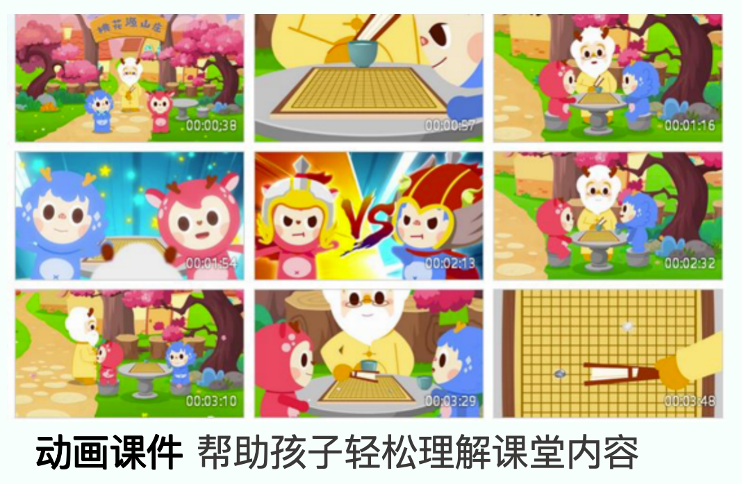 专为4-8岁孩子量身打造,简单、有趣、易懂、好学。用孩子喜欢的动画教学,带孩子进入围棋世界。