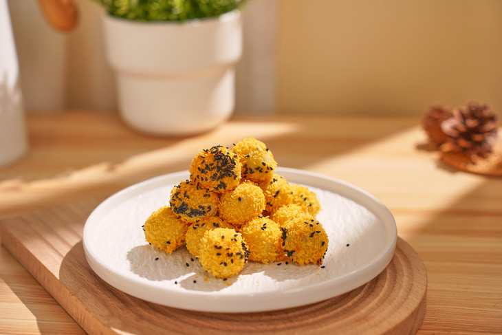 3、裹一层蛋液、一层面包糠+芝麻,放进空气炸锅,间隙不要太近