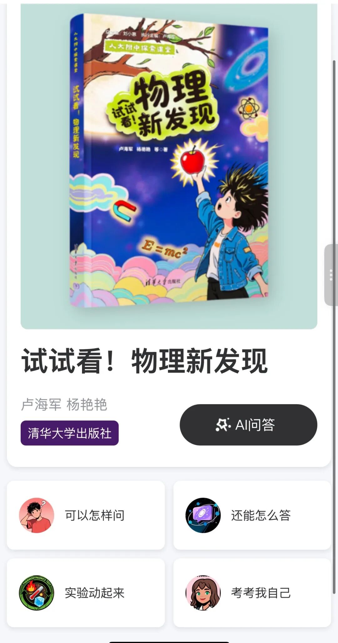 “可以怎样问?”“还能怎么答?”“实验动起来”“考考我自己”四大版块,解答孩子学习过程中的各种疑惑。