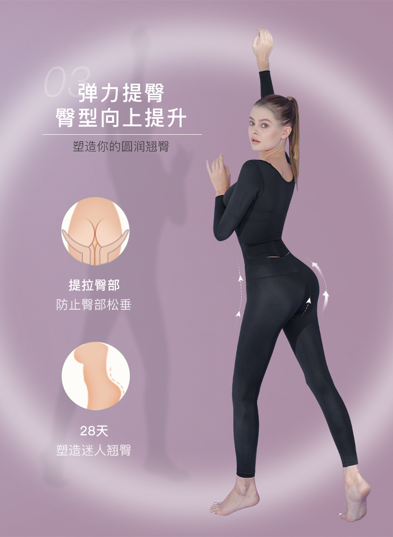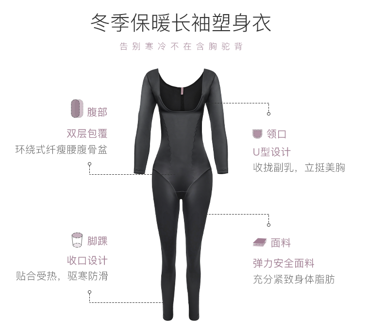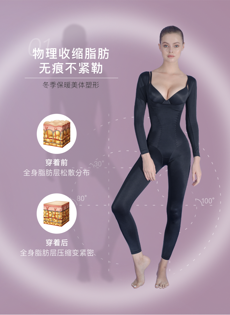 这款连体塑型衣沿用的物理收缩脂肪,无痕不紧勒,穿上以后,会让你全身的脂肪层压缩便紧密。