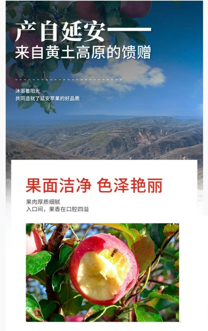 咬上一口,只听见咔嚓一声,口感十分清脆。与此同时,丰富的汁水瞬间爆出。自然清新的甘甜与果香瞬间充满整个口腔,带来极大的满足感。延安苹果拥有着独特的风味与口感,得益于当地独特的地理环境和气候条件,以及果农们精心的种植和管理。无论是直接食用,还是用于制作果汁、沙拉等,都能给人带来美妙的味觉体验。