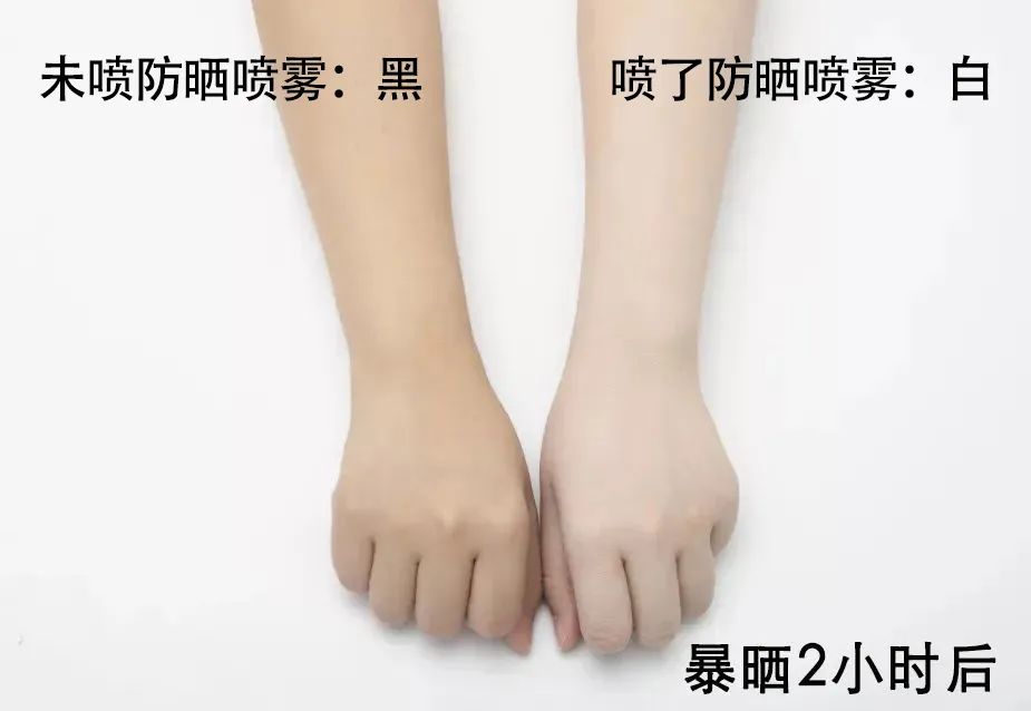 我们还做了真人实验,同一个人的两只胳膊,一支喷上儒意的防晒喷雾,另一只什么都不喷,暴晒2小时后,黑白分别,可见其防晒效果很强!