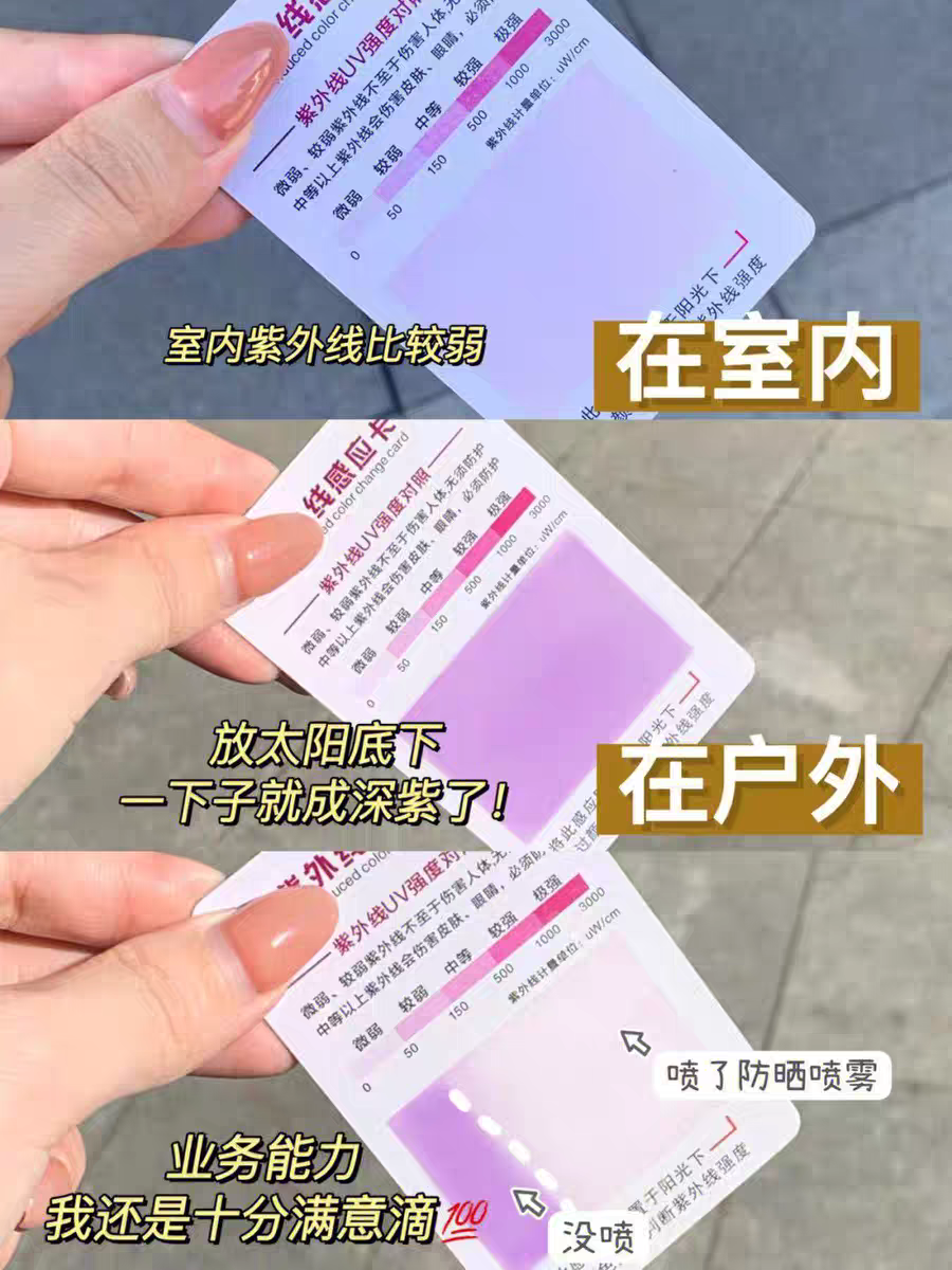 我们自己也做了个小实验,使用紫外线卡对比测试,喷上儒意防晒喷雾的区域,明显没有受到紫外线的影响!