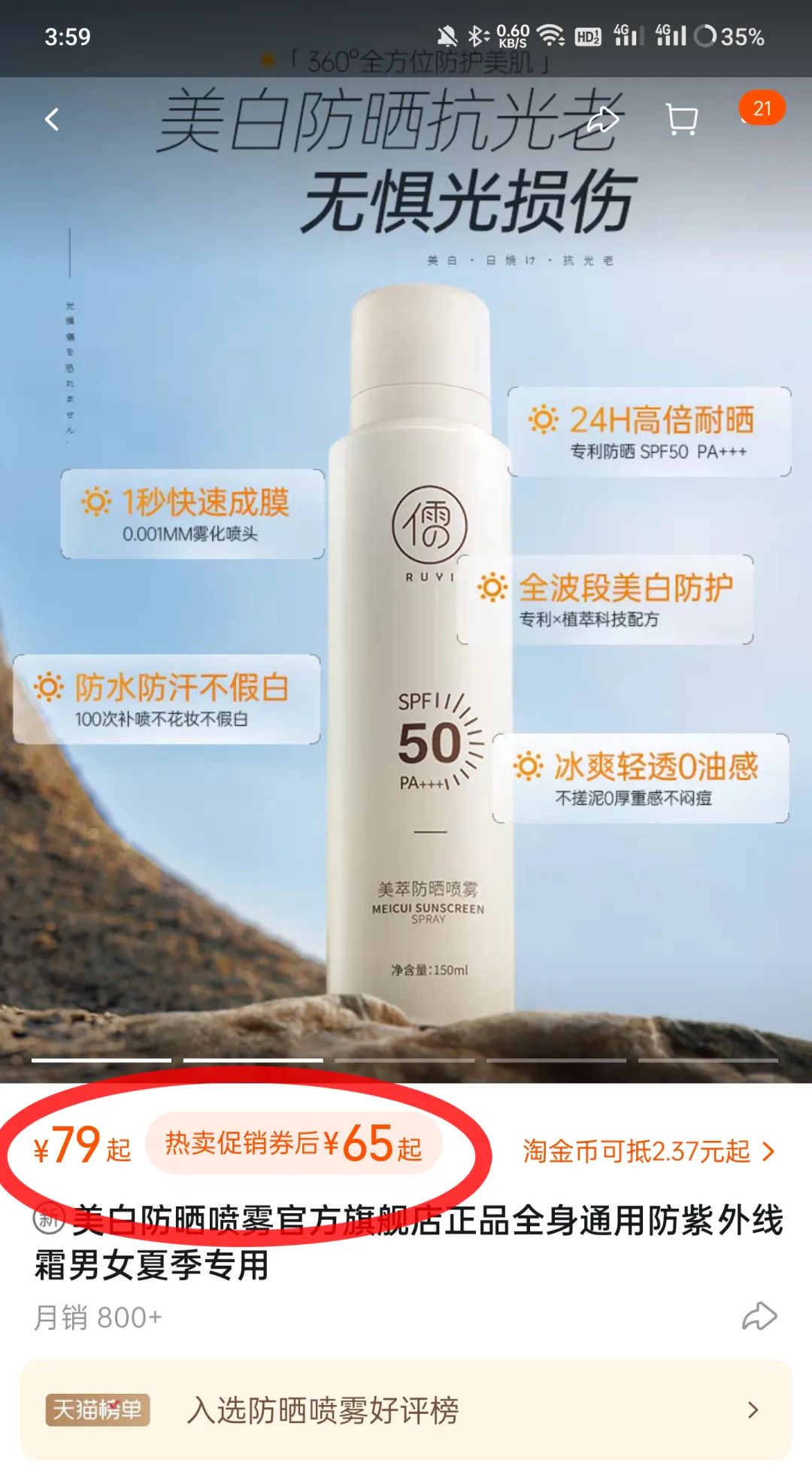 儒意的这款防晒喷雾,防晒系数达到了SPF50 PA+++,这是防晒系数里面的最高标准了。