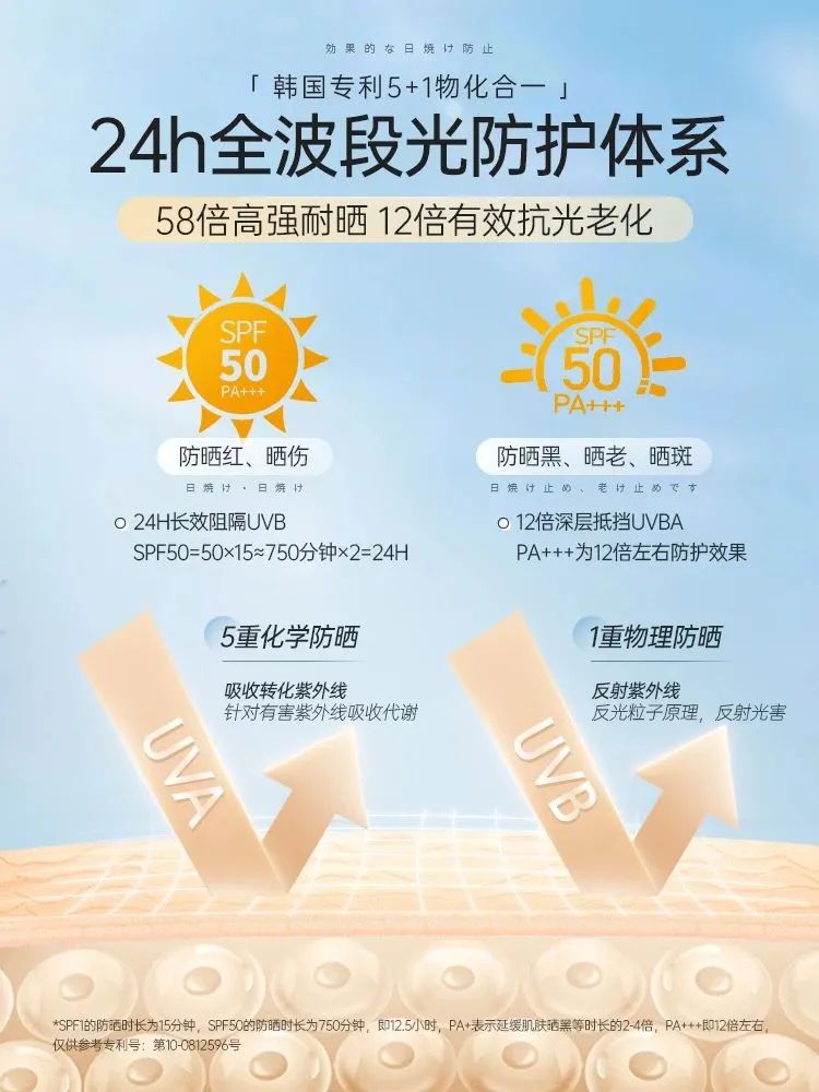 其次是韩国专利5+1物化合一防晒科技。5重化学防晒,可吸收代谢紫外线损伤;1重物理防晒,反射紫外线。