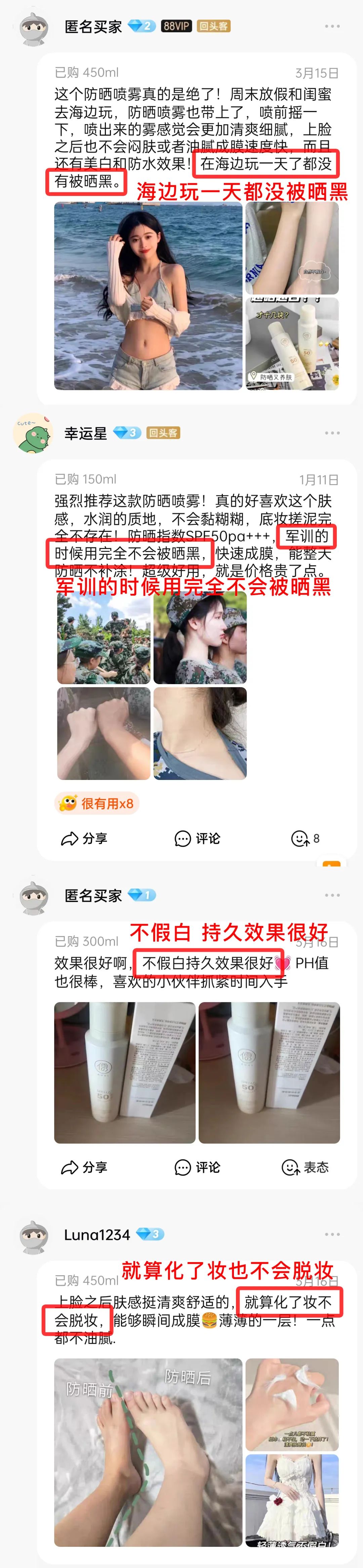 可以说,喷上这款防晒喷雾,哪怕长时间在户外、沙滩强阳光照射都没问题,完全不用担心晒伤、晒黑,反而越用越白!