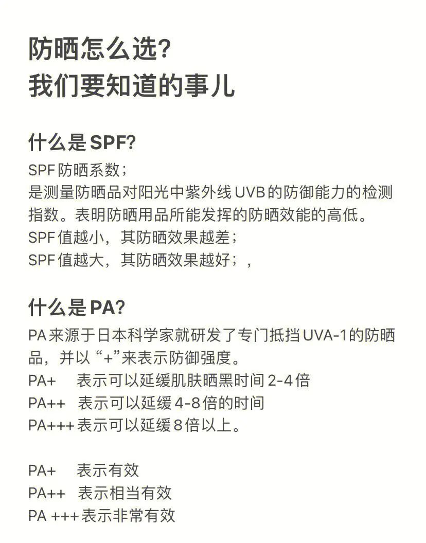 一般通用的选择标准,就是看防晒系数,也就是SPF值(防晒指数)和PA(防晒等级)。