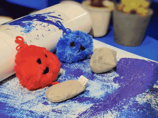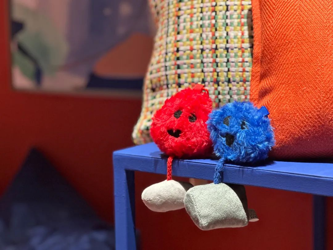 首先,我们是根据伊夫·克莱因的两幅经典海绵雕塑原作《SE 191无标题的蓝色海绵雕塑》《SE 206无标题的粉红色海绵雕塑》进行的设计转换。因此,玩偶的设计样式基本还原了原作,其中红色与蓝色的海绵玩偶,除颜色以外大体一致,看起来如同一对双生子。俗话说“自古红蓝出CP”,红与蓝分别是暖色调和冷色调的代表,给人感觉如水与火一般,对比强烈又不失和谐统一,这也体现出伊夫·克莱因精神思想的两面性——“红”与“蓝”。