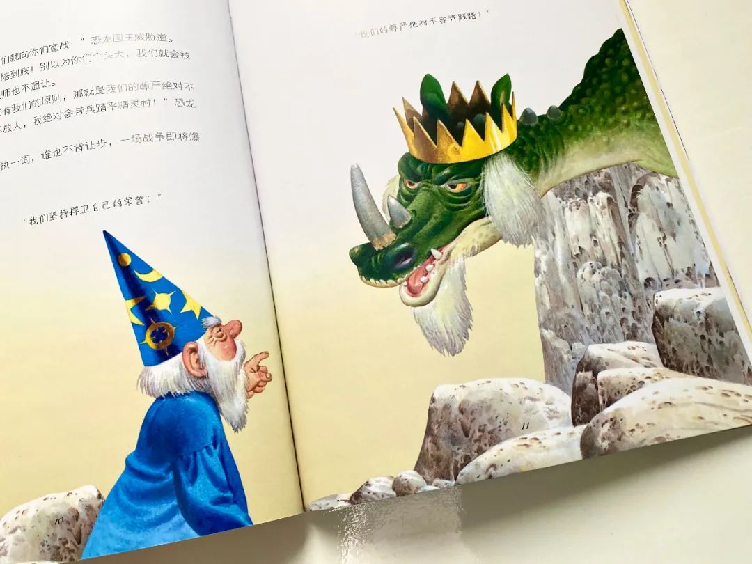 当恐龙国王威胁要宣战时,小精灵魔法师毫不退让地说:“我们坚持原则,奉陪到底!别以为你们个头大,我们就会被你们吓倒!”