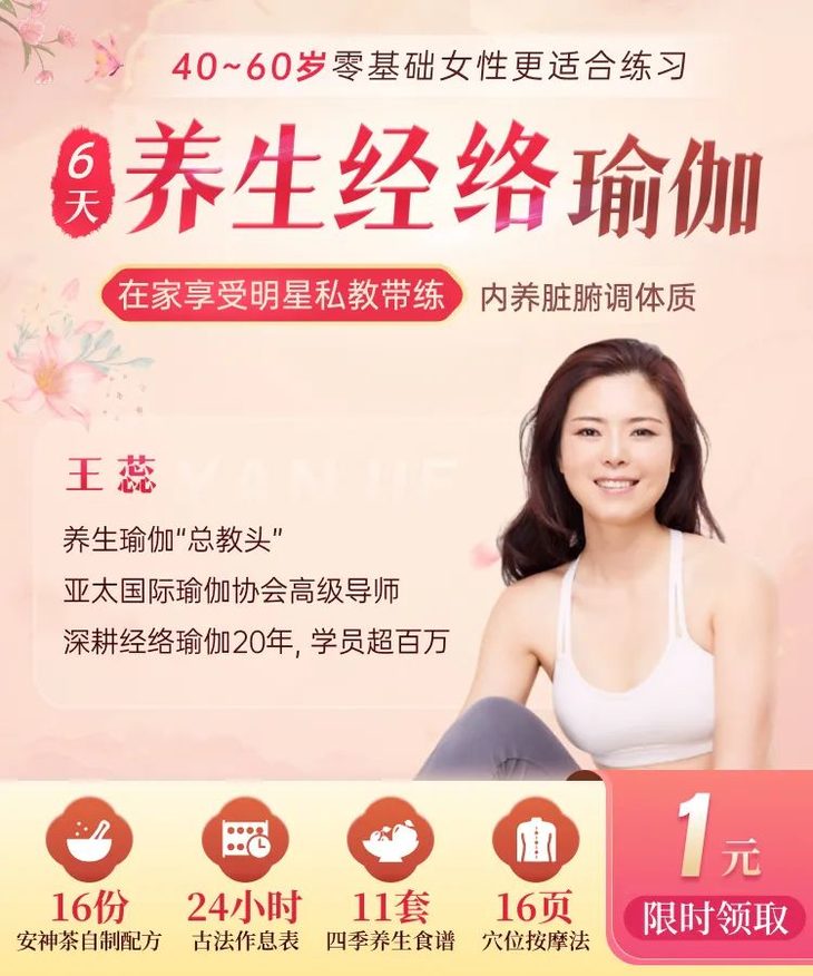 今天,我们把专攻中老年瑜伽23年的资 深导师—王蕊请过来,给大家带来《6天经络瑜伽养生营》。