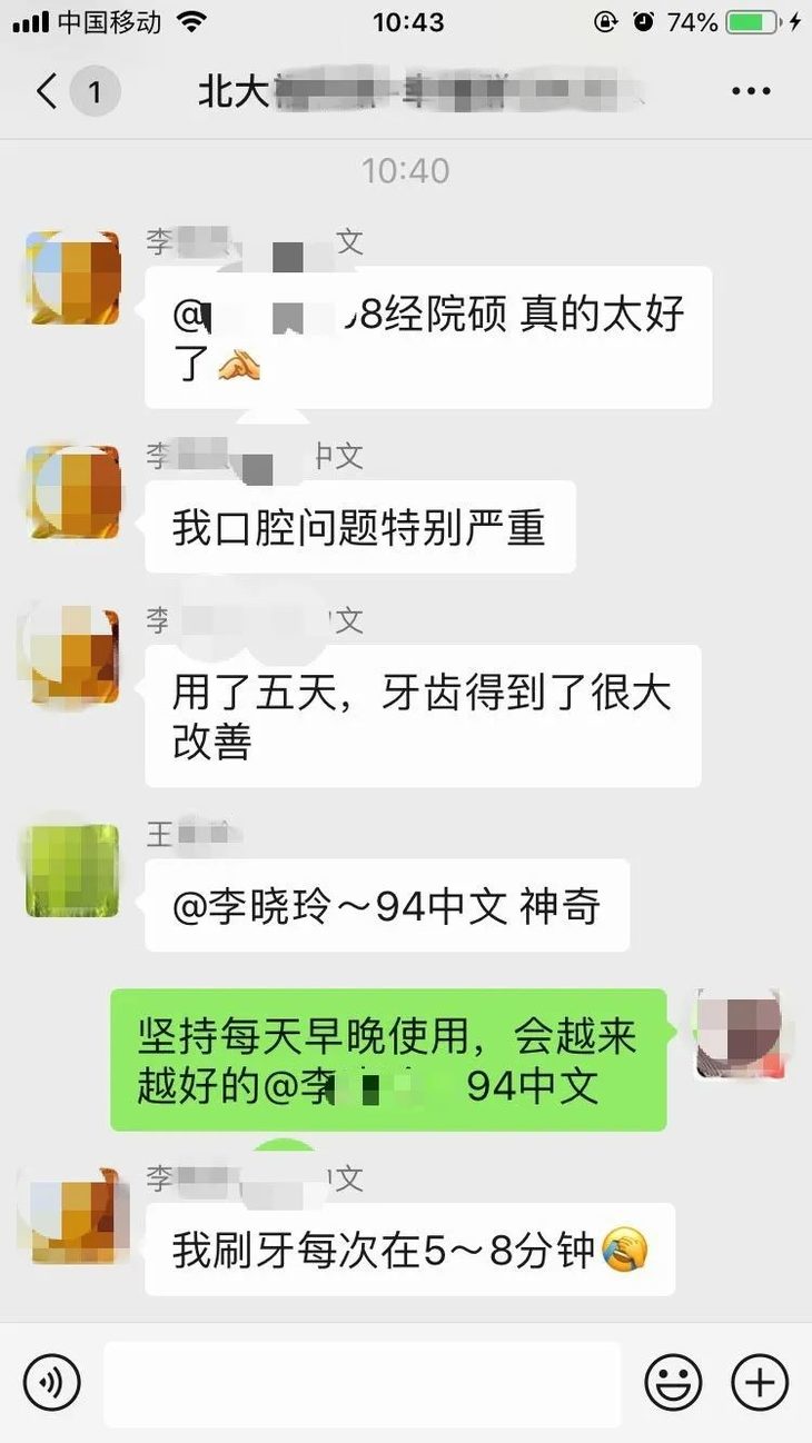 创业最大的快乐来自于客户的肯定,来自于对客户的价值。当一个个朋友、师兄师姐同学向你欣喜地反馈,他们自己或家人本来松动要拔掉的牙齿保住了,困扰多年的牙龈出血、牙齿敏感好转了,牙菌斑牙结石刷掉了,牙齿真的变白了,口气真的清新了,当他们真诚地向你表示感谢,甚至很遗憾没能更早地用上你的牙膏,你会感到来自内心深处的真正快乐,这种快乐会让人上瘾,会给你继续前行的巨大信心和动力。