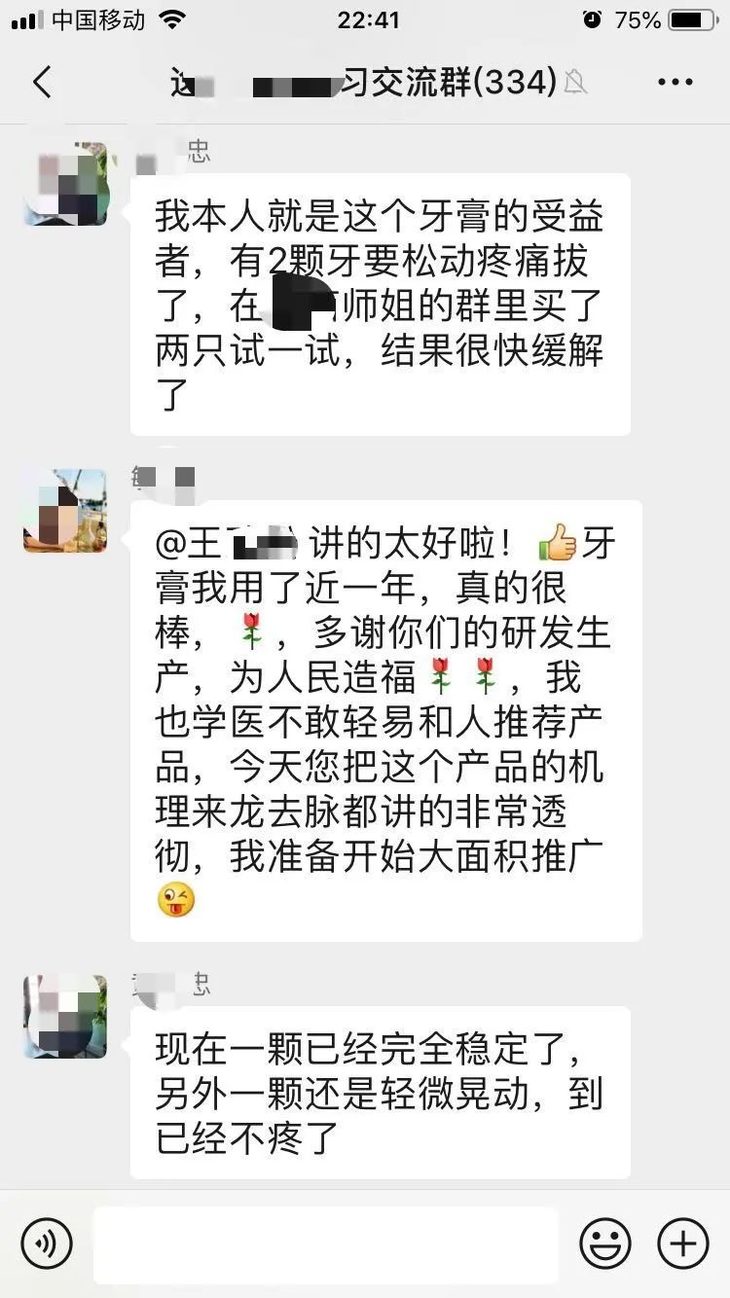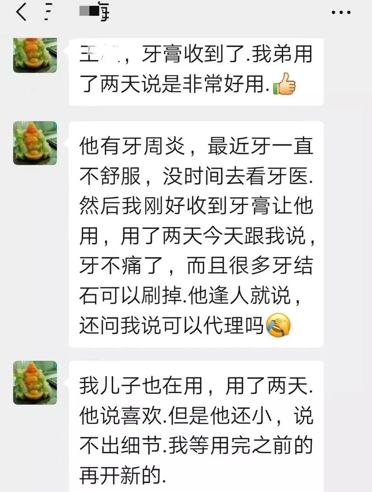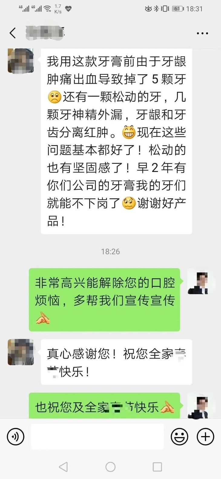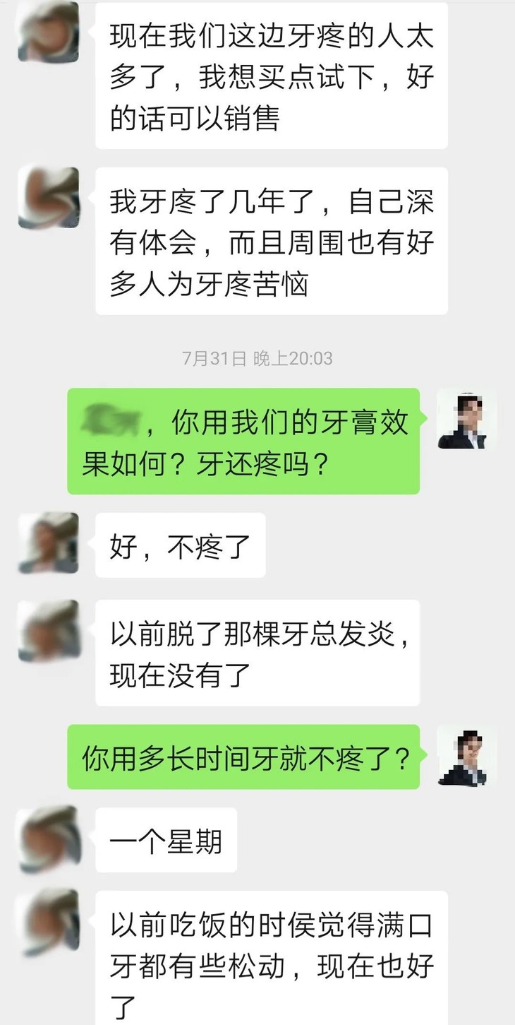 后来,一件巧合的事情发生了。大概在春节后的第二周,专家给我打电话,他说,他当时真没把我们的牙膏当回事,拿了之后就随手扔在了角落。春节期间,他吃骨头时硌到了一颗后槽牙,出现了牙隐裂导致的牙齿敏感。结果他自己一直用的那款牙膏刷了两个星期都没有明显好转。这时候他想起了我们的牙膏,既然我说牙膏那么好,那就找出来姑且试试。让他惊喜的是,才用了3天,牙齿敏感问题就解决了。至此之后,这位专家开始成箱购买我们的牙膏送高端客户,成了我们的超级铁粉。今年春节前买了多箱赠送给客户。