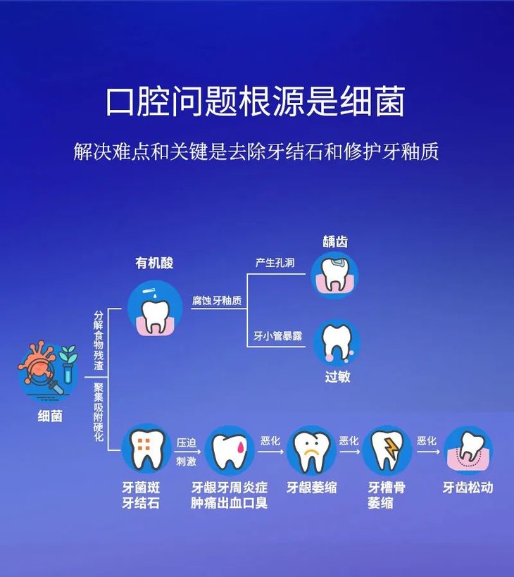 口腔问题的表现虽然各种各样,但根源其实只有一个,就是口腔细菌。细菌主要通过两个途径危害口腔健康。一是细菌分解食物残渣获得营养,大量繁殖并附着在牙齿表面形成牙菌斑,牙菌斑硬化形成牙结石,牙菌斑牙结石压迫导致牙龈肿痛、出血、萎缩、牙龈牙周炎症,牙龈牙周问题恶化导致牙齿松动,最终的结果是牙齿脱落。二是细菌分解食物残渣产生有机酸,酸溶解腐蚀牙釉质,产生两个严重后果,一是形成龋齿,牙齿结构被逐渐破坏;二是导致牙本质小管暴露,冷热酸甜通过牙小管直接刺激神经导致疼痛即牙齿敏感。