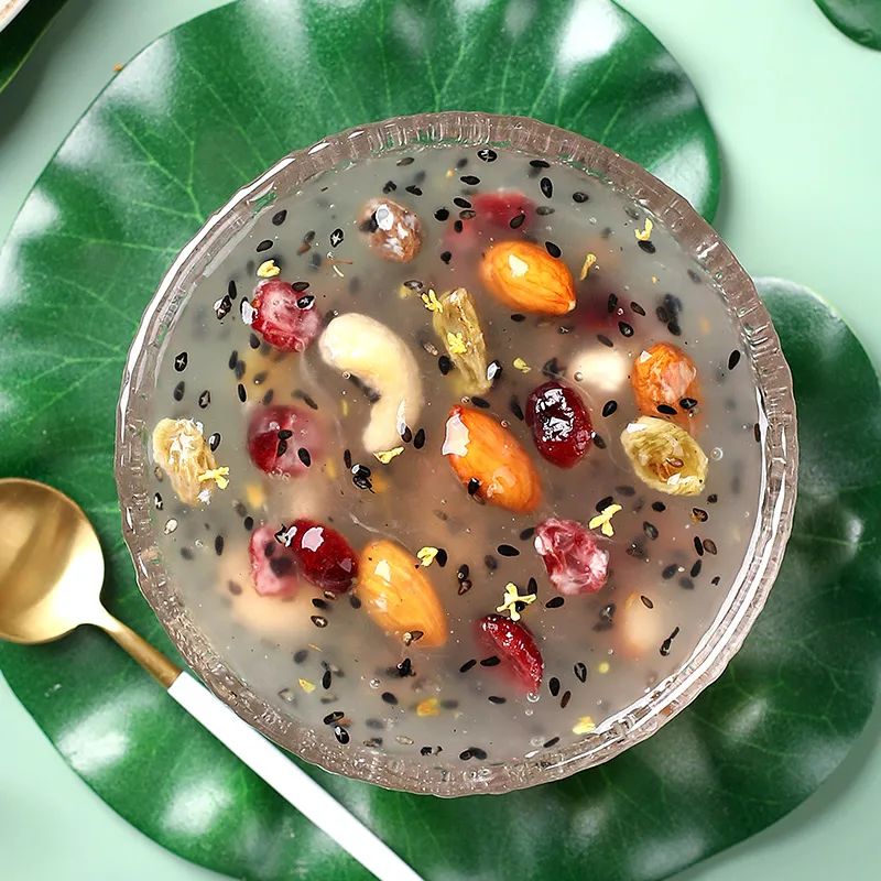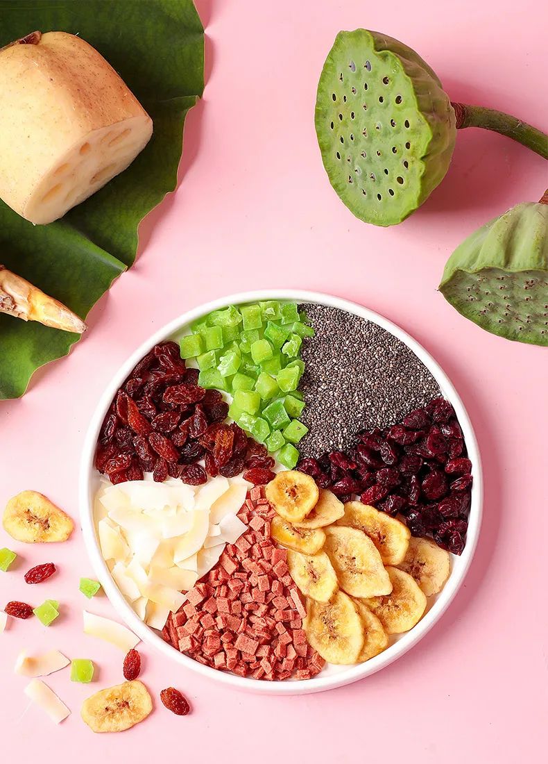 这款水果藕粉羹,在原本平淡的纯藕粉基础上加入了各种鲜制果干,有红提、猕猴桃、香焦、椰片、黑芝麻、冰糖粉、奇亚籽、山楂片等等...