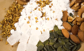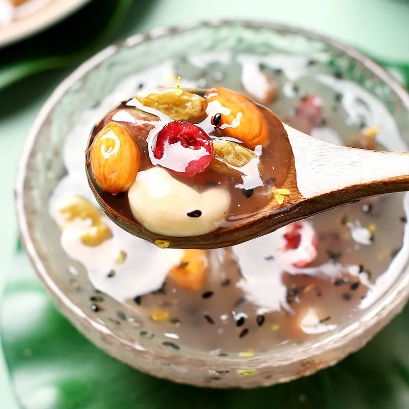//藕粉、冰糖、葡萄干、核桃仁、巴坦木、花生、瓜子、桂花、蔓越莓干、葵花籽..
