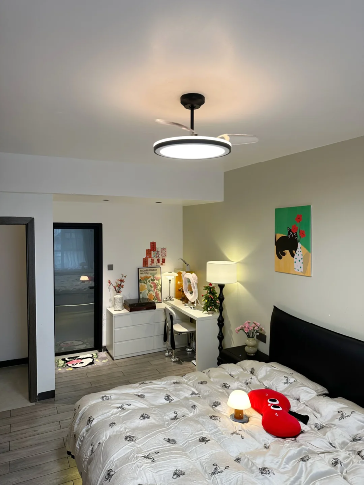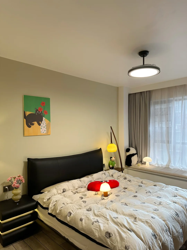 卧室无吊顶,只有一盏风扇灯💡,我们南方的夏天,都是靠空调续命的,但是家里有孩子空调也不能总开,尤其是晚上,一个不小心就容易吹感冒,不开又热的没办法睡觉