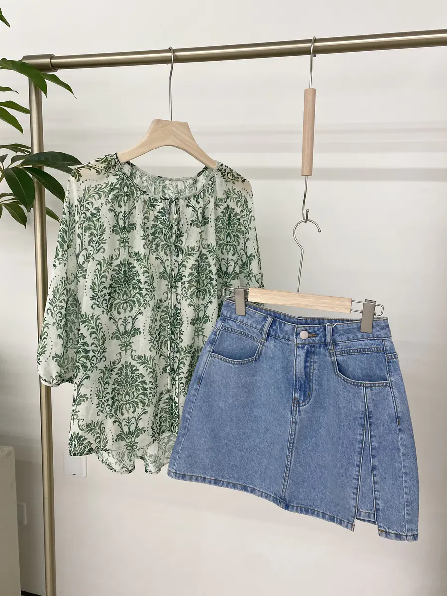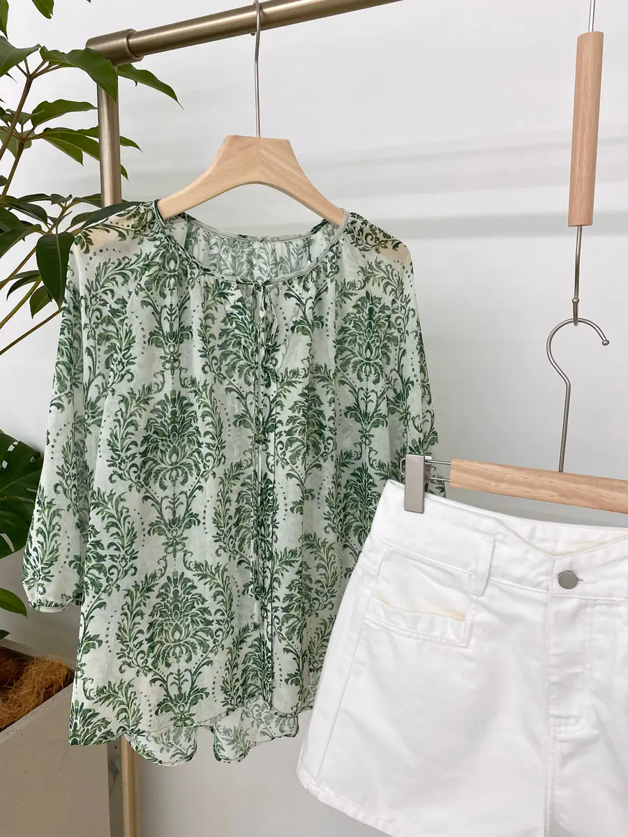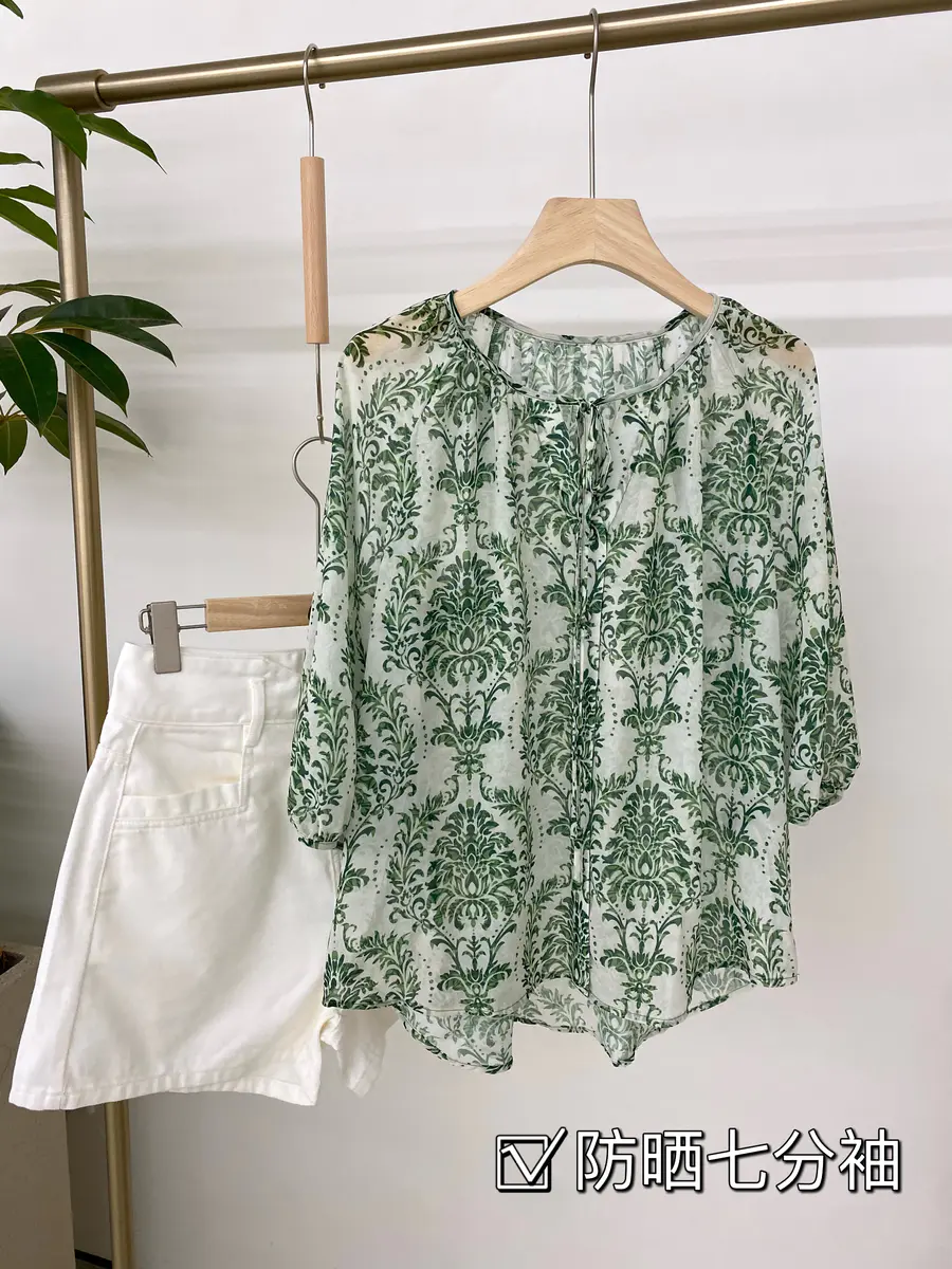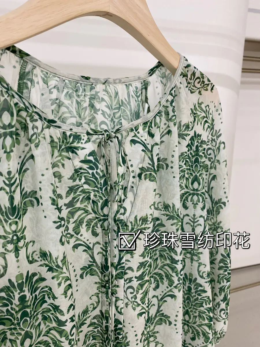 绿意十足的清新感小衫,采用大面积植物印花打造夏日热带丛林氛围感,同时结合清透的雪纺面料,给人一种舒爽自由的感觉;