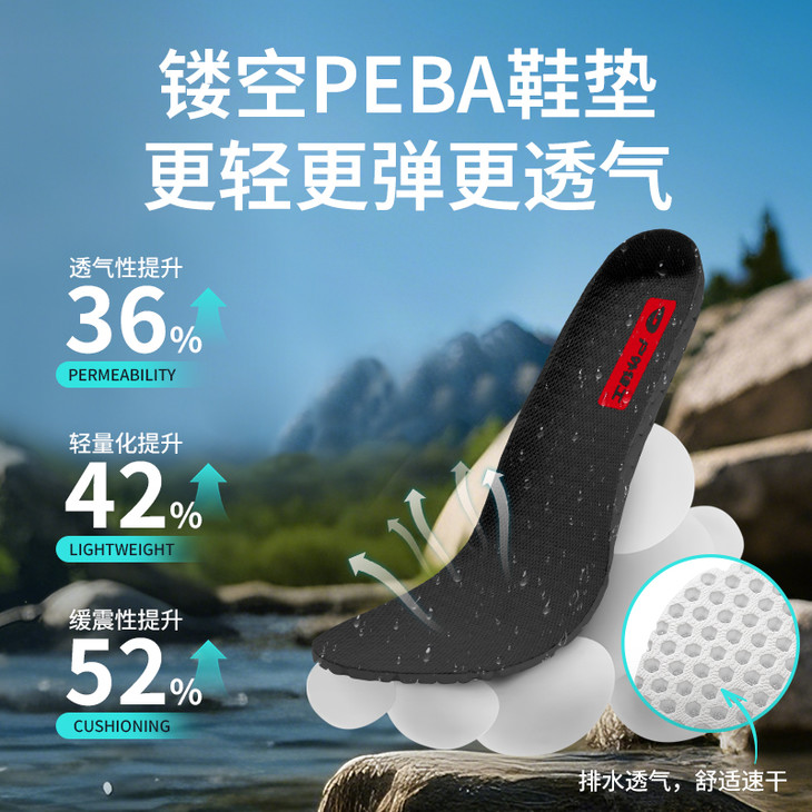 而镂空PEBA鞋垫更是“黑科技”的代表:轻便、弹性十足且透气性提升了36%,让你在炎热的夏天也能享受清爽体验。