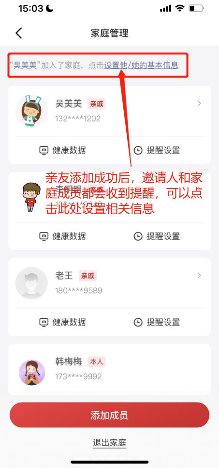 ③ 当被邀请亲友点击【邀请卡片】并完成相关操作后,家庭管理页面会出现该亲友加入提醒,点击可完成相关设置。