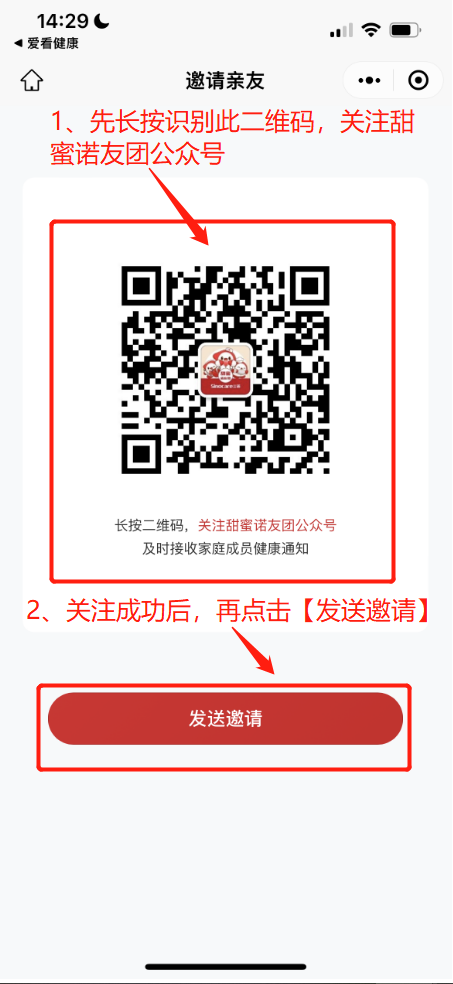 ① 点击【邀请加入】后,进入邀请亲友页面。先长按识别图中二维码,关注甜蜜诺友团微信公众号;