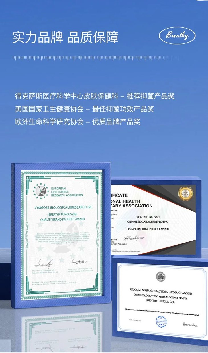 推出后获得德克萨斯医疗科学中心皮肤保健科-推荐抑菌产品奖,美国国家卫生健康协会-抑菌功效产品奖,欧洲生命科学研究协会-优质品牌产品奖。
