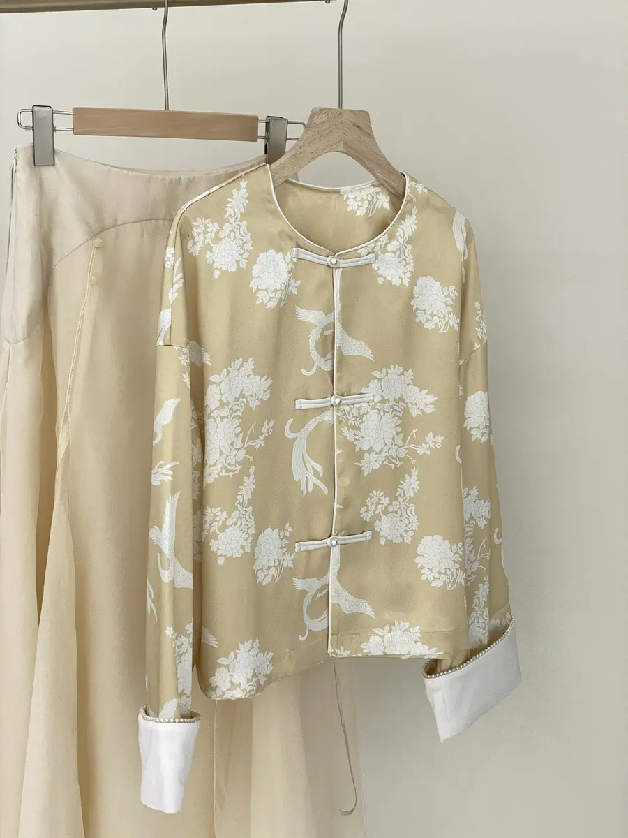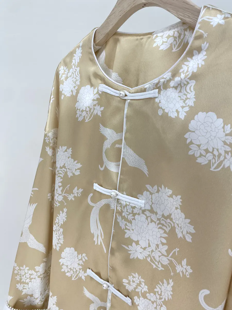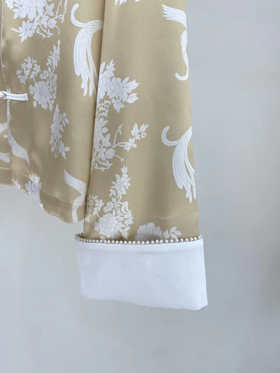 传统圆领门襟,点缀中式盘扣,袖口用珍珠作为装点,更加精致奢华;