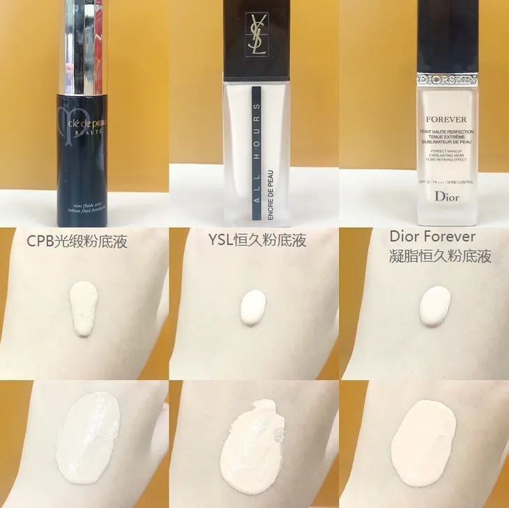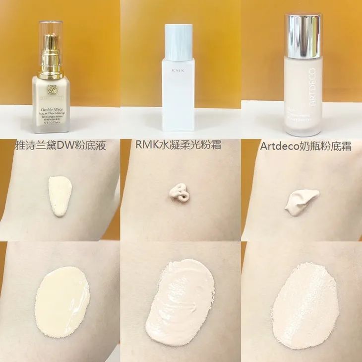 测试下来,cpb以及雅诗兰黛dw的粉底液相对水润,延展性佳。而RMK、YSL恒久、artdeco这三款因为是乳霜质地,所以相对厚重一些。