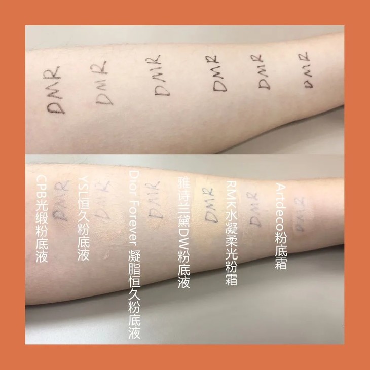 在手臂上分别写上DMR,也只是挤上一泵均匀用美妆蛋拍开,结果令人意外。