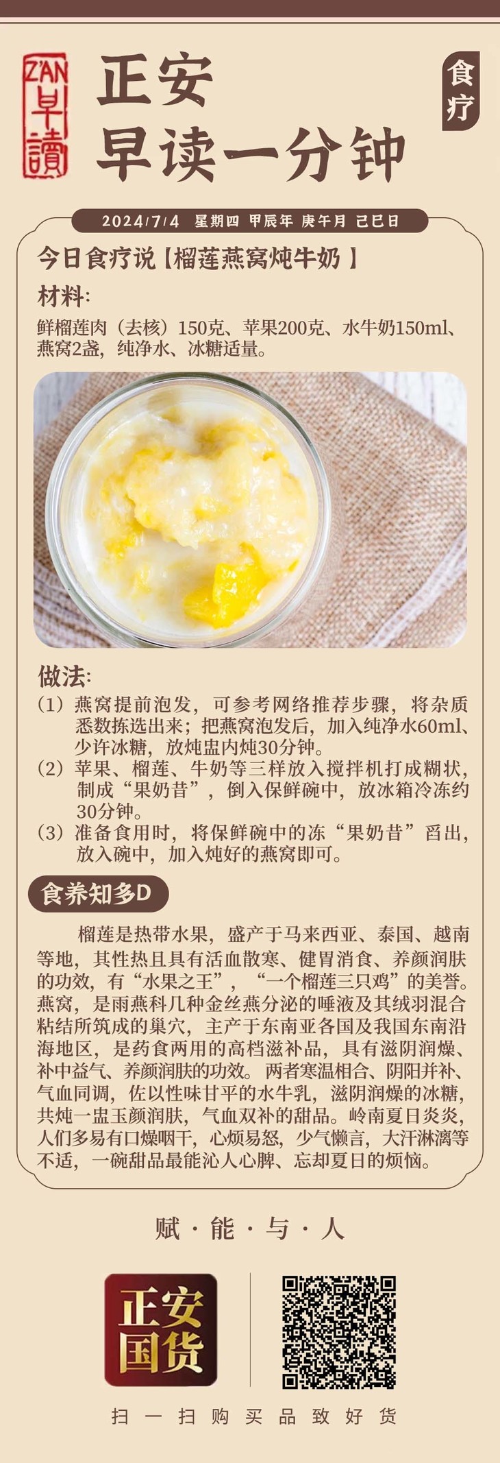 7月4日 应季食方【榴莲燕窝炖牛奶】气血双补