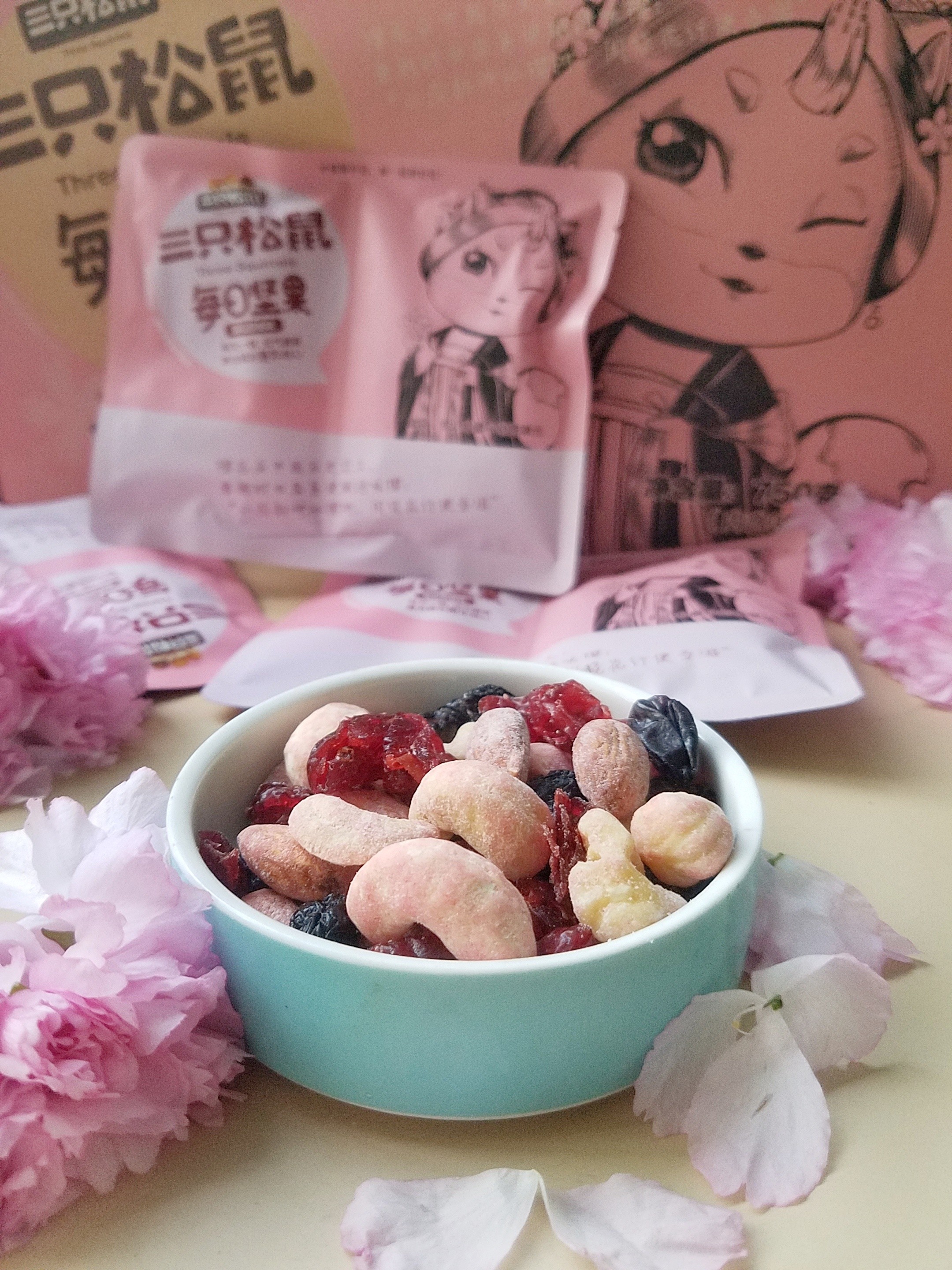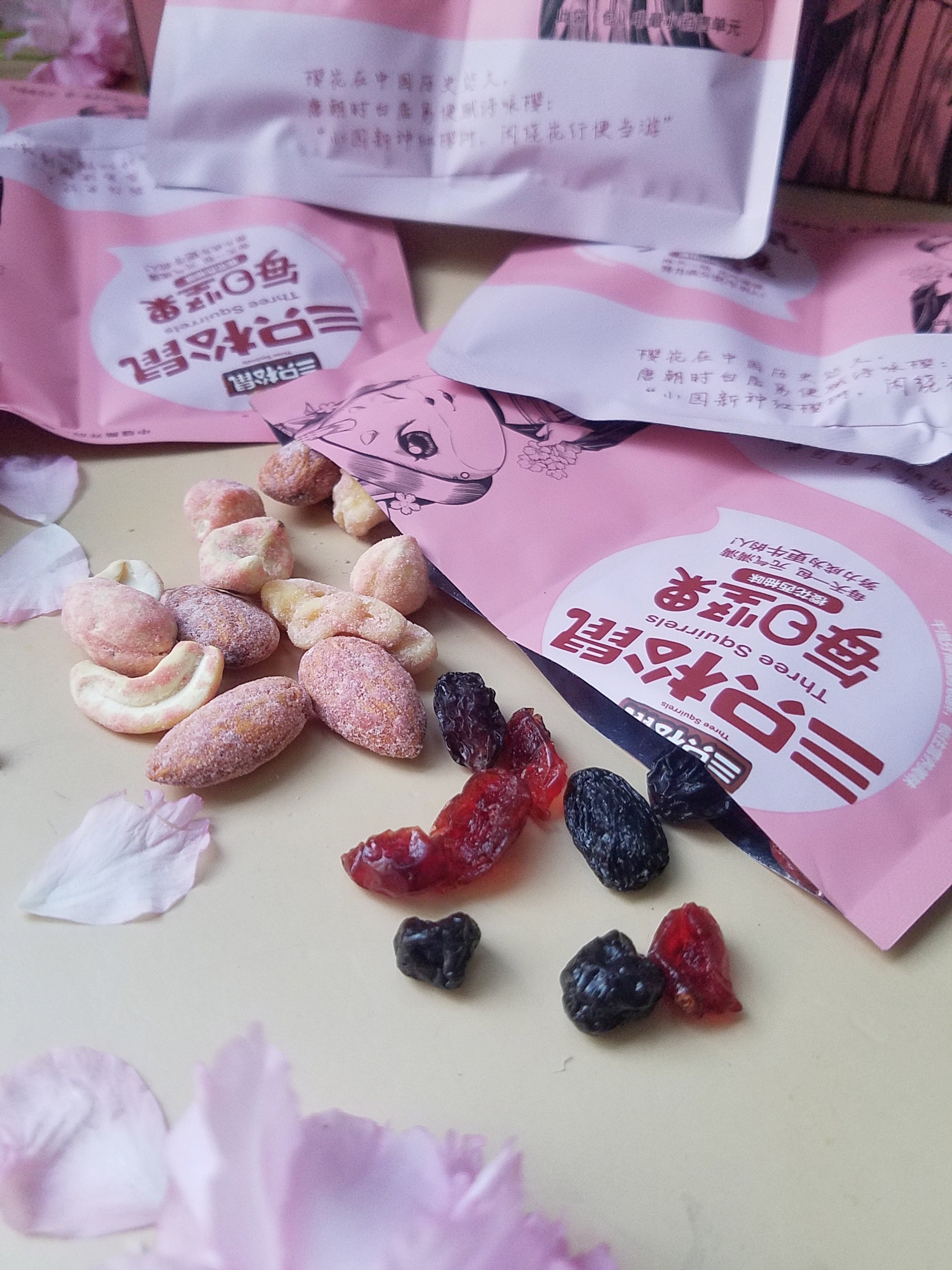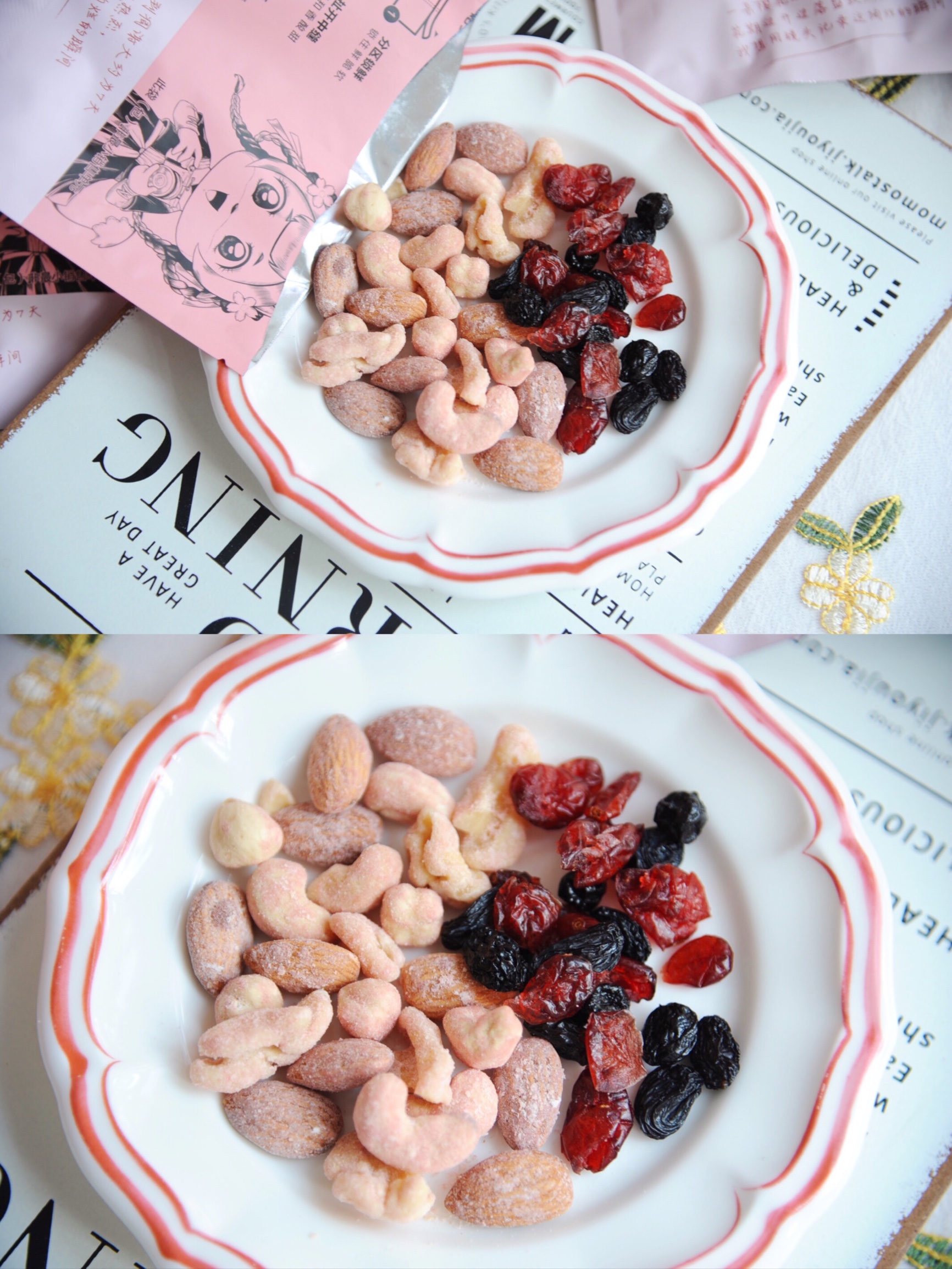粘着淡淡的樱花西柚果粉的坚果,果仁的香味交织着淡淡的果香,每一口都带来春天的气息🌱