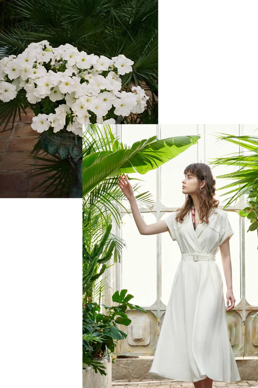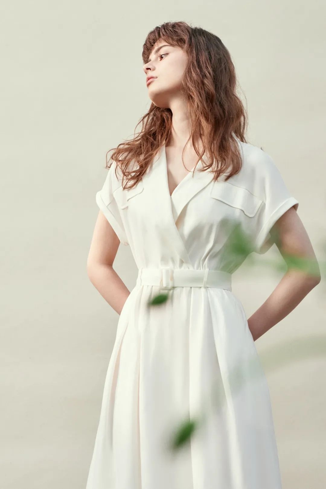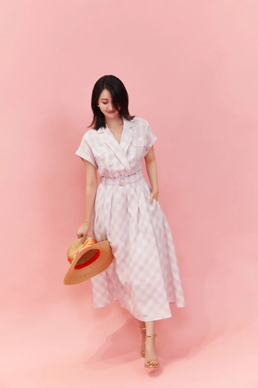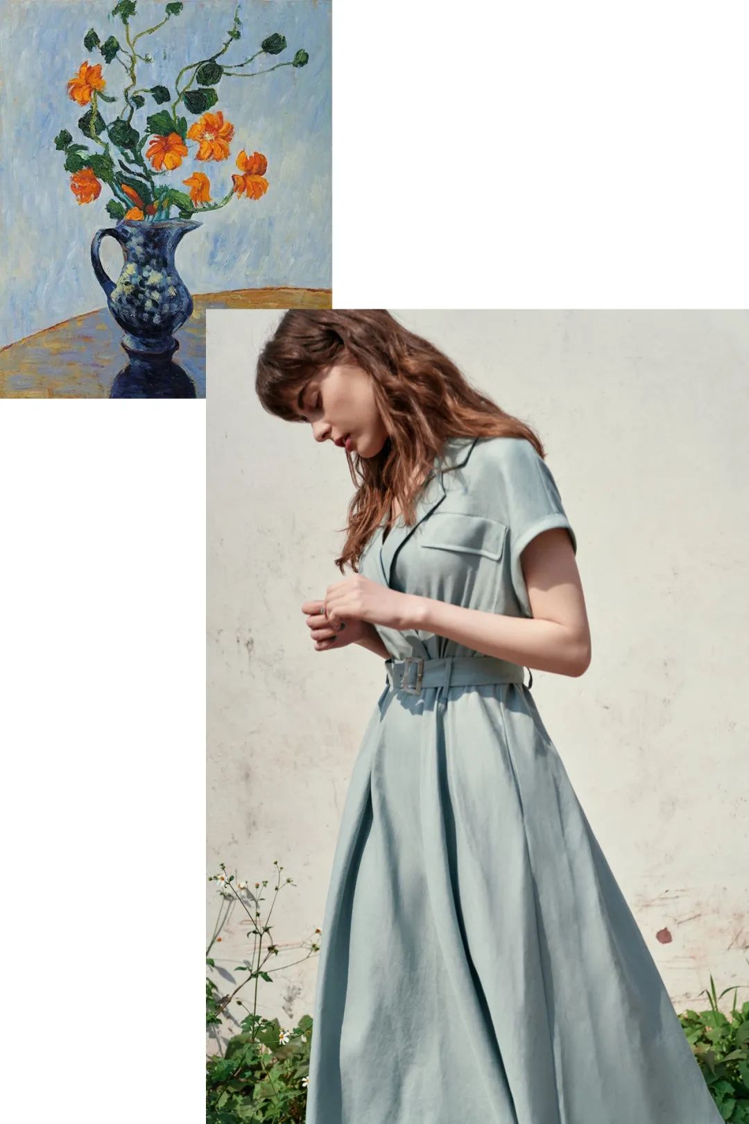 版型设计灵感来自优雅经典的50年代,收腰、方扣腰带、大伞裙下摆、衬衫领。▼
