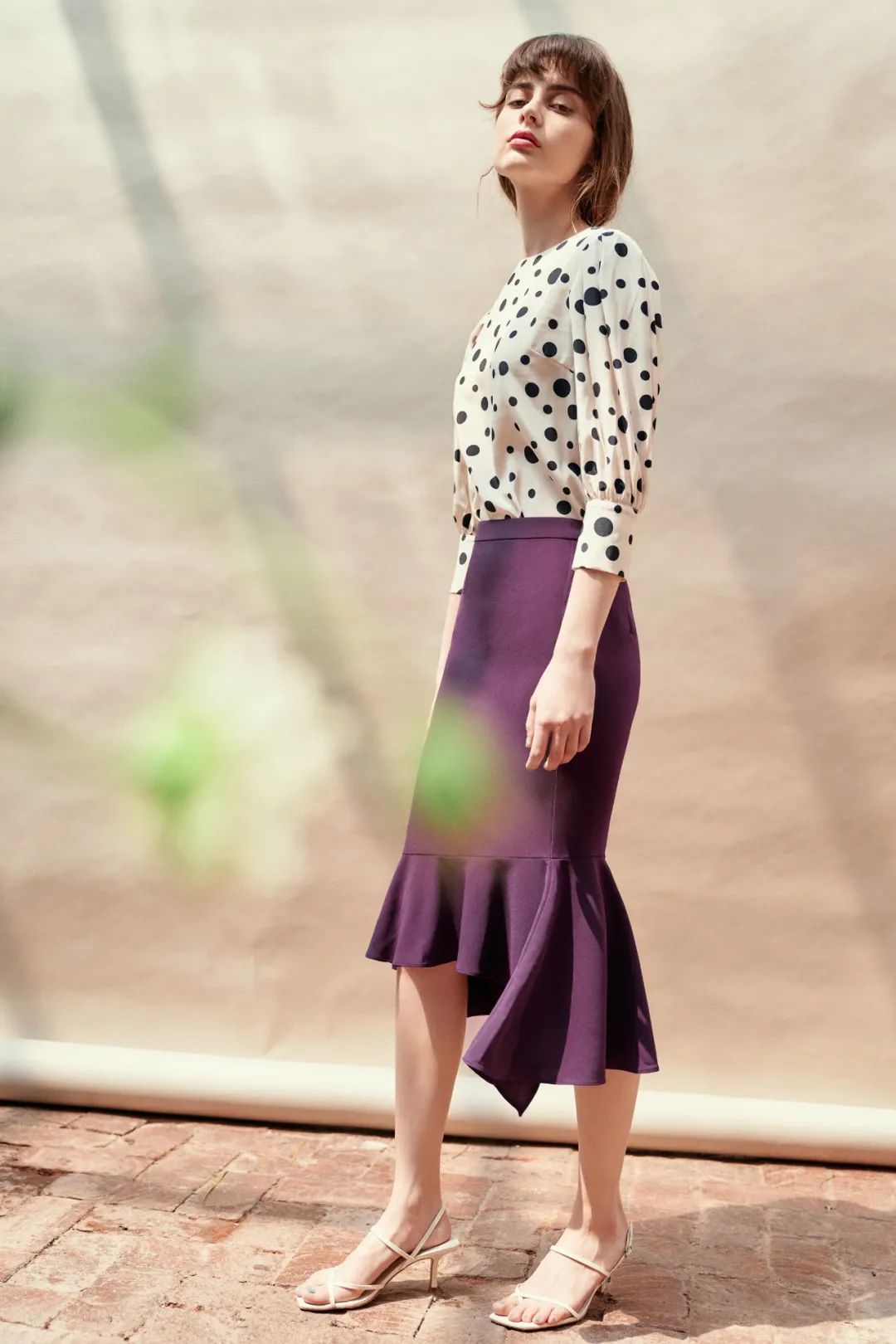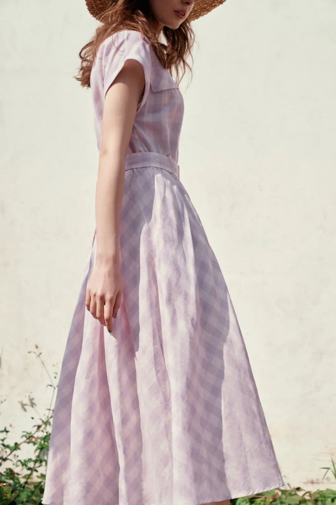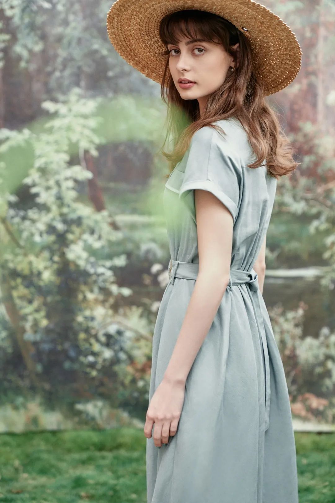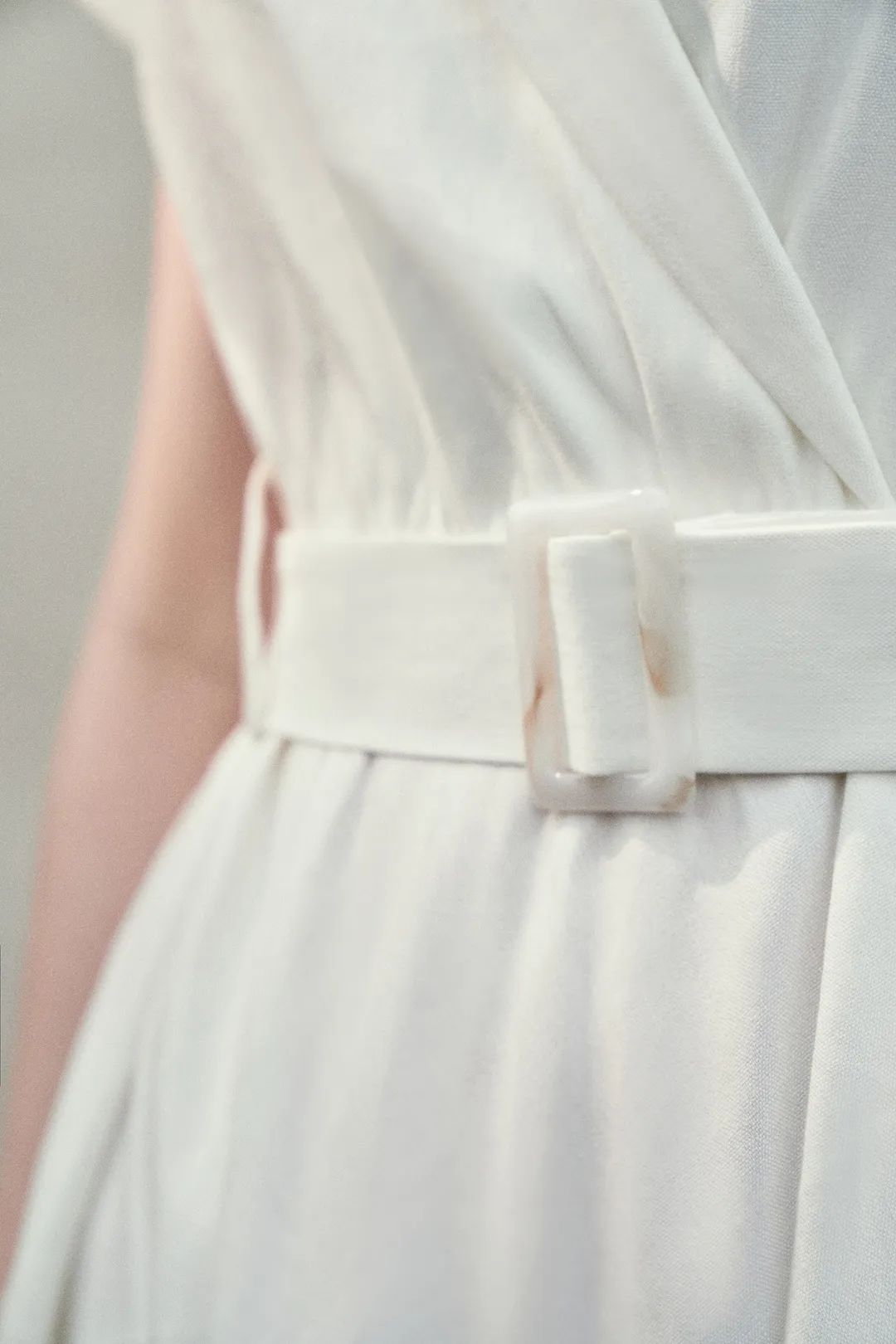 版型设计灵感来自优雅经典的50年代,收腰、方扣腰带、大伞裙下摆、衬衫领。▼