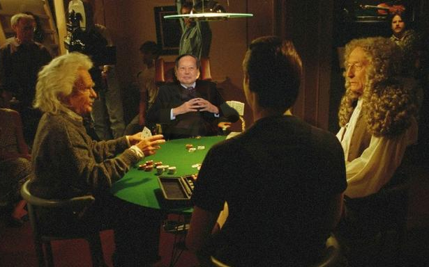 上帝、牛顿、爱因斯坦、玻尔组成牌局。