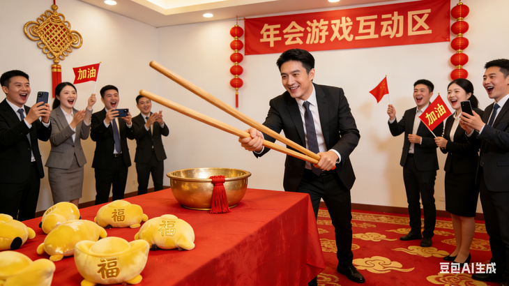 推荐理由:经典怀旧无门槛,蒙眼转圈圈敲锣的过程充满不确定性与爆笑反差,全员围观呐喊互动感拉满,还自带吉祥讨喜寓意,是年会暖场引爆氛围的必备游戏~