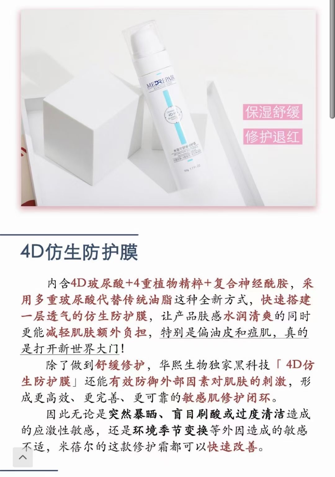 华熙生物集团旗下——米蓓尔MEDREPAIR,源自华熙生物多年潜心研发,“精于修复,专注美丽”为消费者解开敏肌密码,4D-HA四重活水创专利配方取代市场主成分,提供解决敏肌问题的方案。