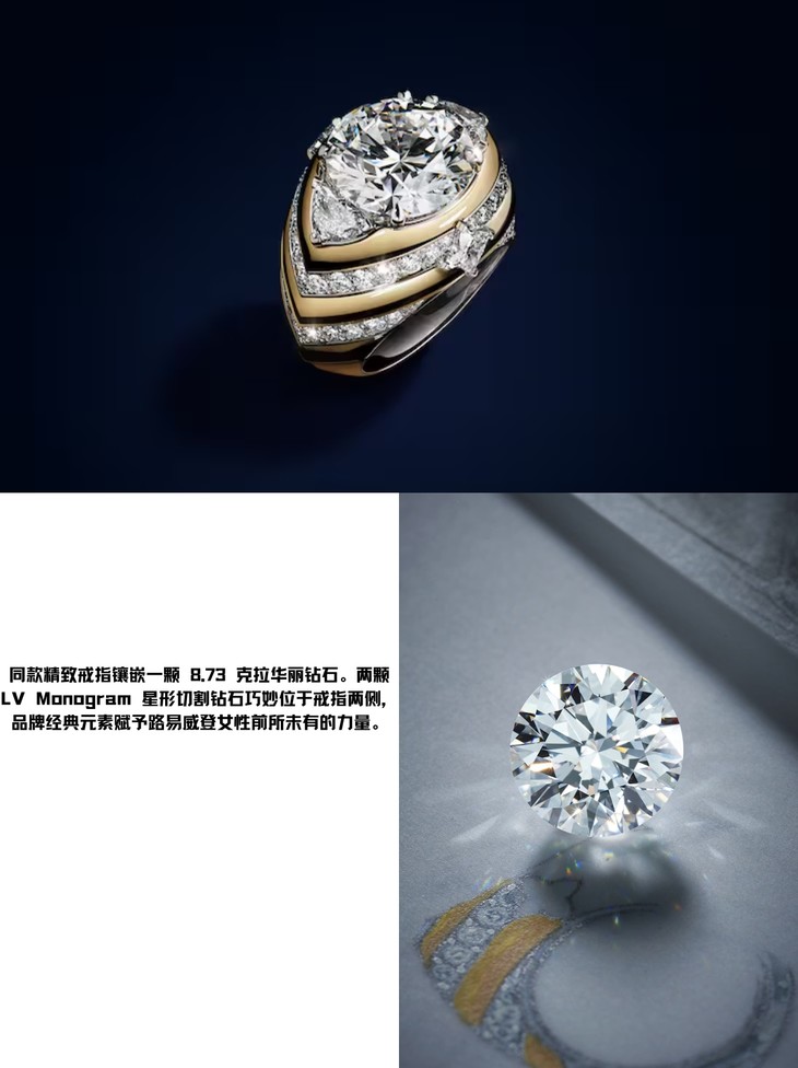 💍 而那精致戒指,犹如星辰中最耀眼的存在,8.73克拉的华丽钻石坐镇中央,两侧LV Monogram星形切割钻石守护,戴上它,仿佛整个宇宙的力量都凝聚在你的指尖。
