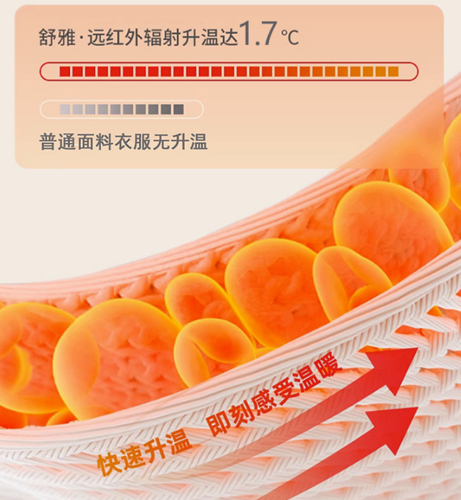 在制作过程中,还在纤维中加入了远红外粉末,将人体散发的热量积蓄起来,以远红外的形式释放,直接升温1.7℃,不会像穿其他打底衫一样,温度低时,刚上身会有一丝凉感,穿上它,有一丝丝温热感。
