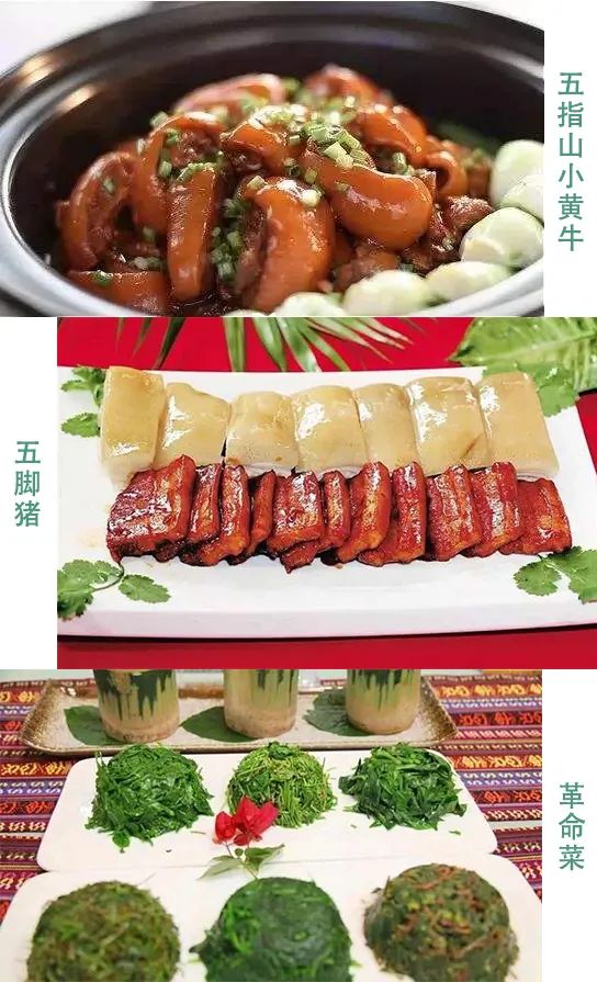 其中,革命菜、树仔菜、五脚猪、蚂蚁鸡、水满鸭、五指山小黄牛等,在仁帝山餐桌上应有尽有。