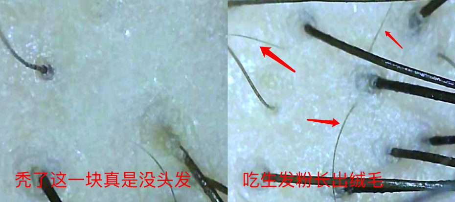 我用毛孔放大镜看的,原本秃的那块真是没头发,我都愁死了,吃了大概半个月,那个位置就满满长出小绒毛了。