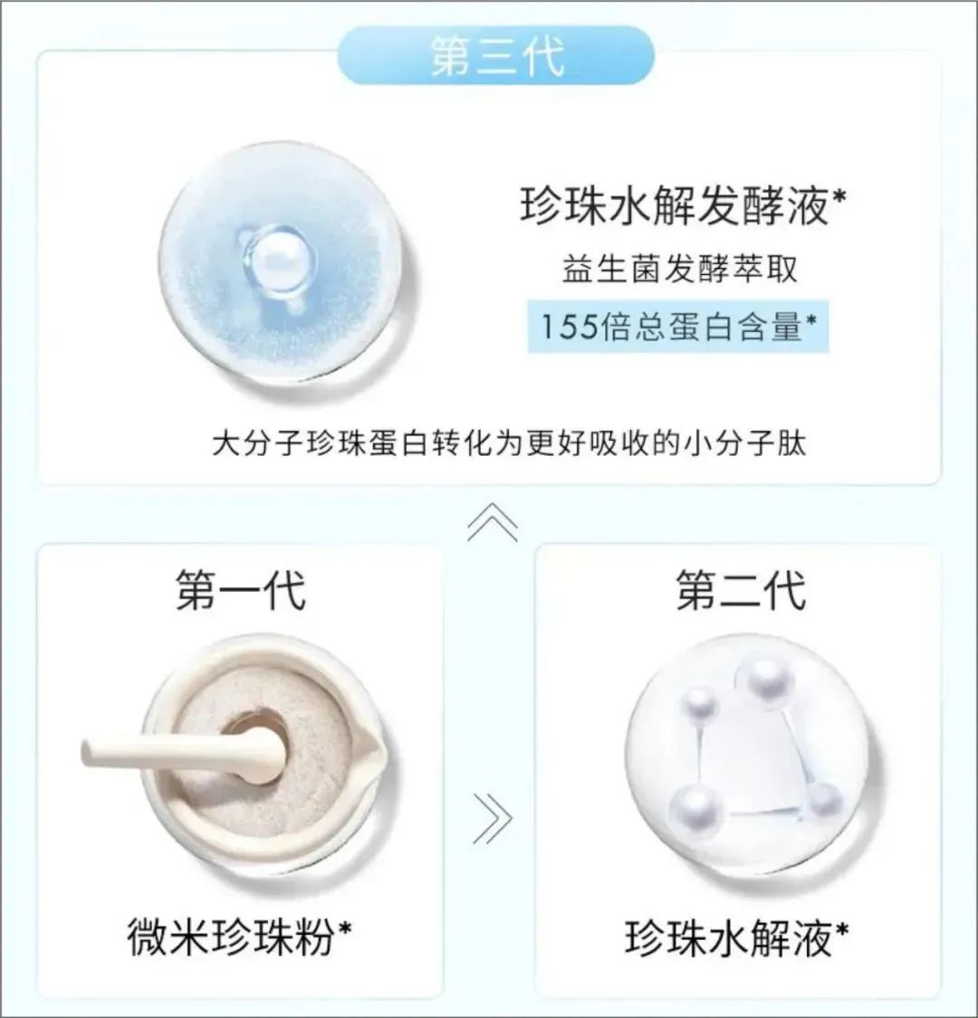 通过益生菌发酵萃取,大分子珍珠蛋白,转化成能被肌肤直接吸收的小分子肽。