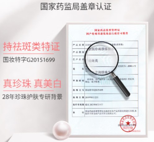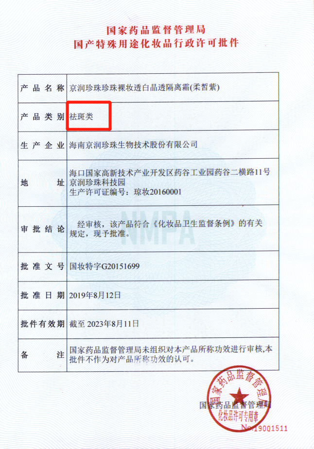 「京润珍珠粉隔离霜」,更是拥有国家药监局颁发的“淡斑特证”,在药监局官网就可以查到!