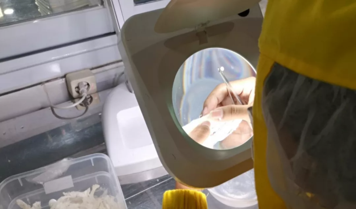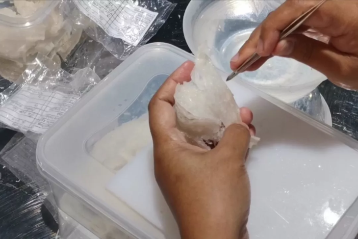 其次,是燕窝原料的挑毛。挑毛的过程是非常复杂的,首先要将燕身里面一些大的杂质和燕毛挑出来,经过初步的修剪挑毛之后,还要再进行几次反复认真的精挑,最后还需要在放大镜下进行检验,这样才可以把燕毛全部清除干净。