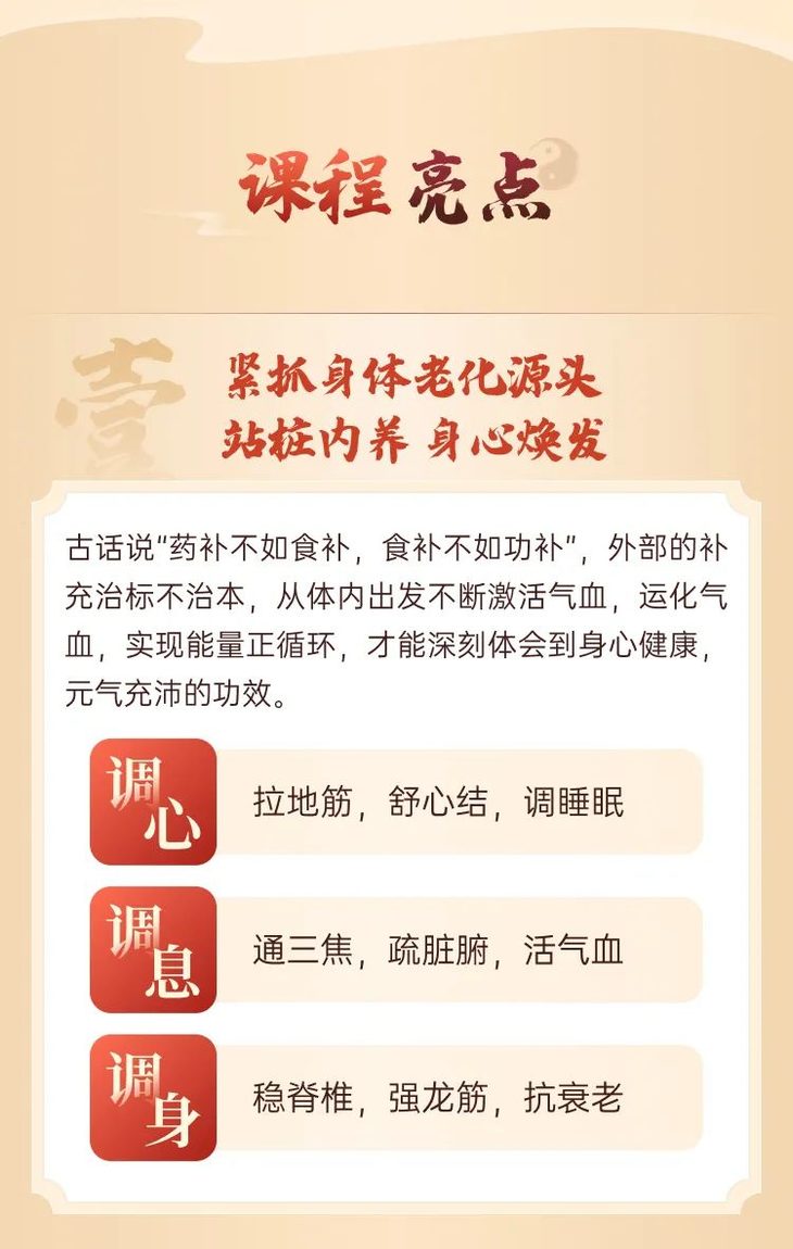 “调身”“调息”“调心”,三元合一,从内到外强健机体、冻龄养颜、延年益寿,焕发年轻光彩。