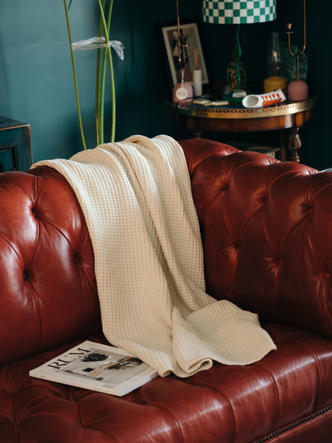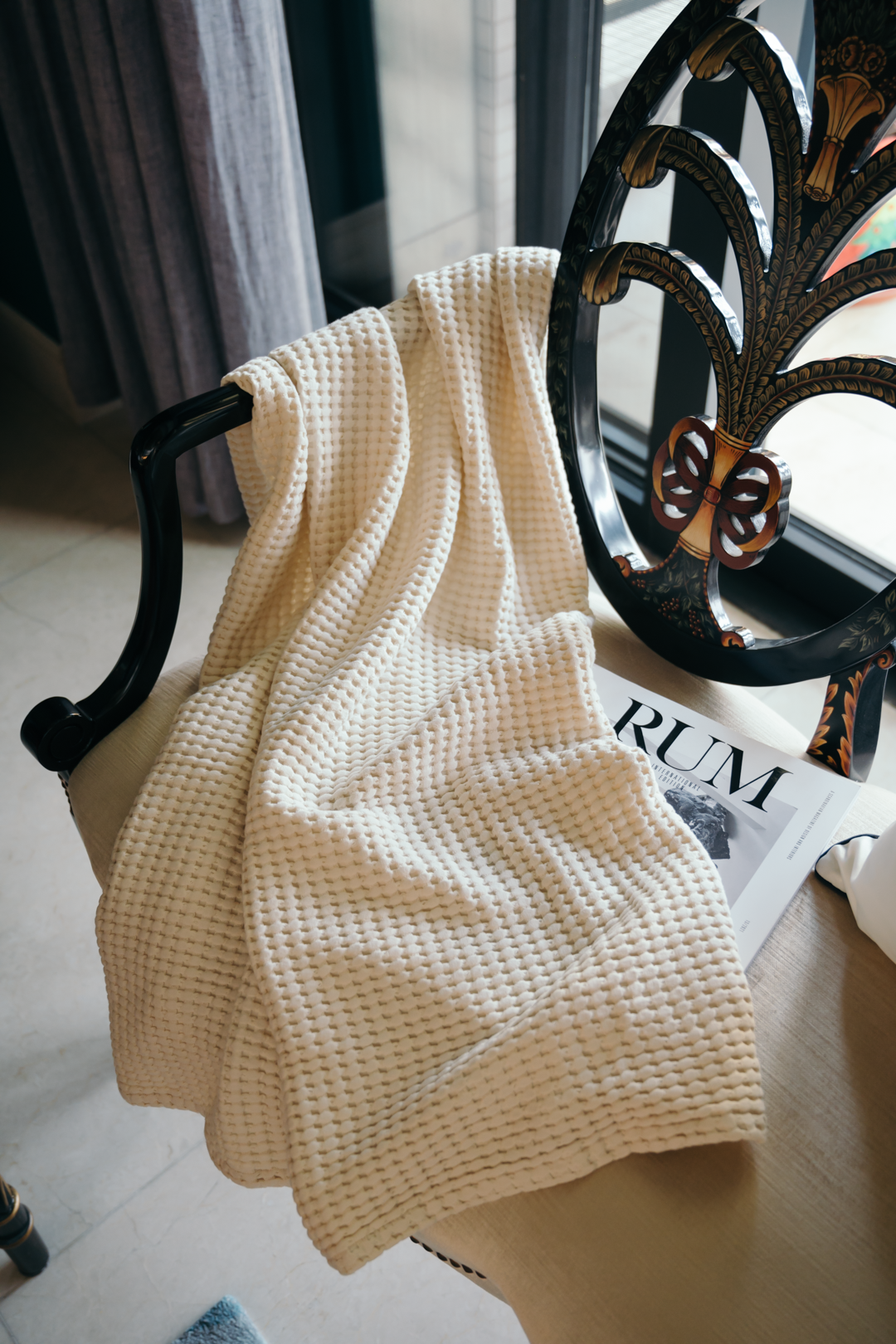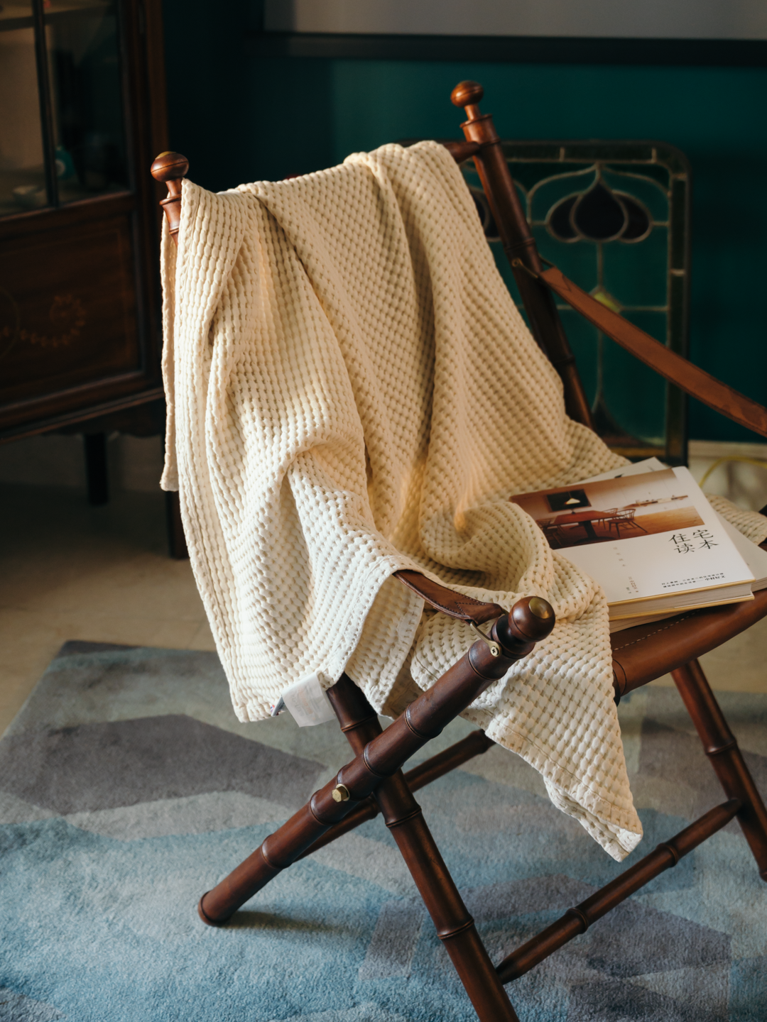 夏天广州的室内空调从早开到完,我也习惯在常待的地方放一张华夫格毯,家里、工作室都备了一张,觉得凉了,随手拉过来就盖上。▼