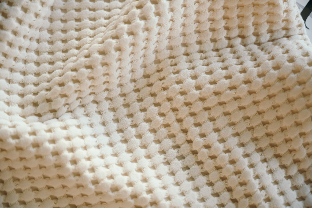 很多人家里的床品爱买缎面的,觉得丝滑贴服,但午睡毯我觉得华夫格优点也很明显:防风、透气干爽,不会贴在身上,还不会打滑。它模拟了蜂窝结构,更加立体透气,形成空气微循环,所以它有“恒定温度”的作用~