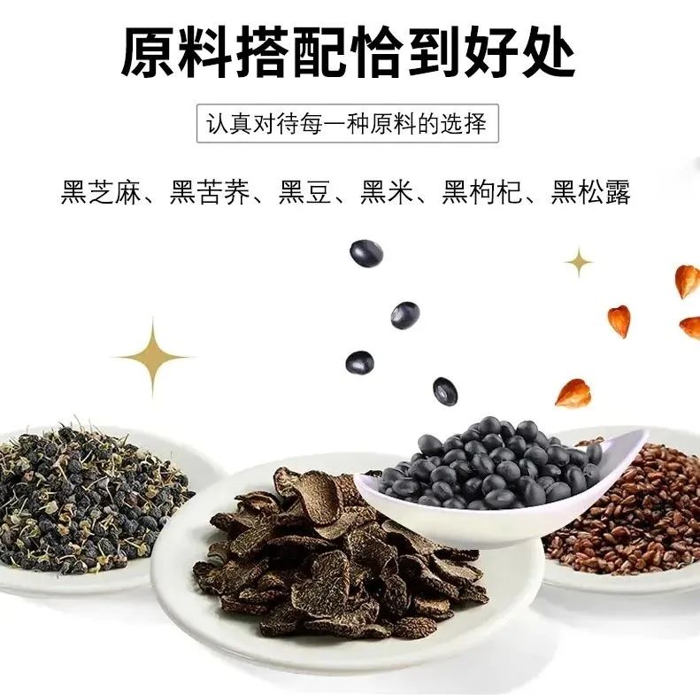 以黑枸杞、黑松露、黑芝麻、黑苦荞、黑米、黑豆这6种食材为原料,甄选道地食材,科学配比而成,滋阴益肾,润肤养发。