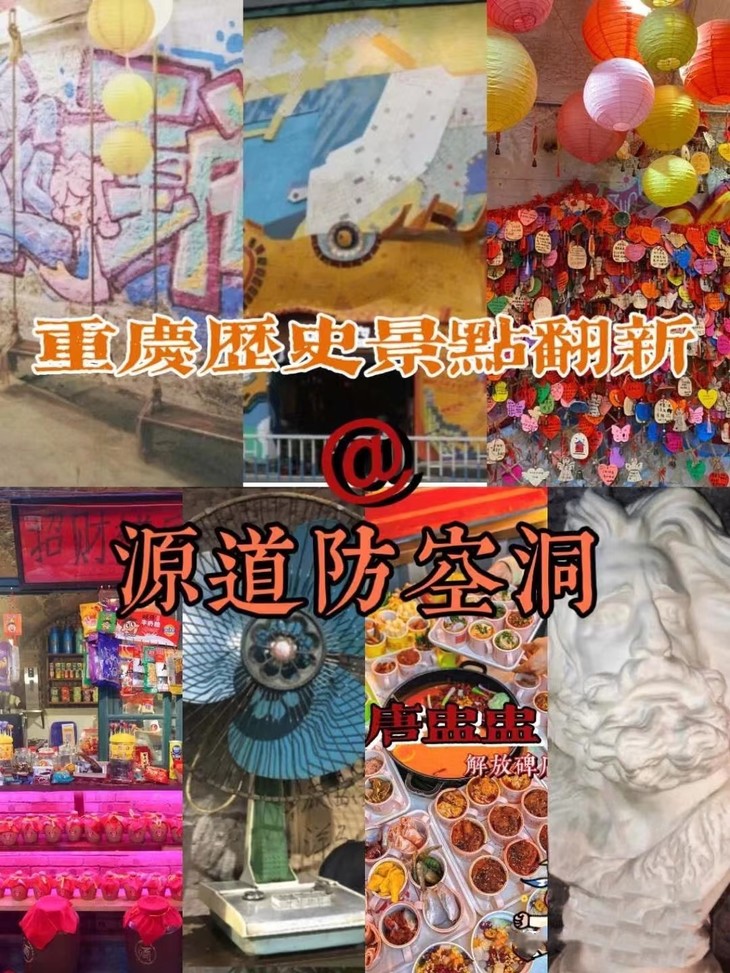 单轨李子坝站、源道防空洞、磁器口古镇、钟书阁、涂鸦一条街、重庆交通茶馆