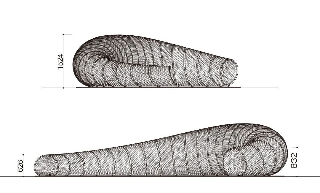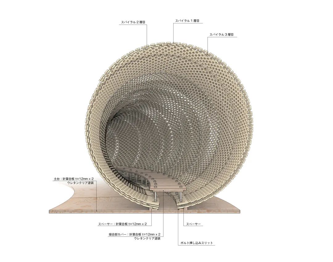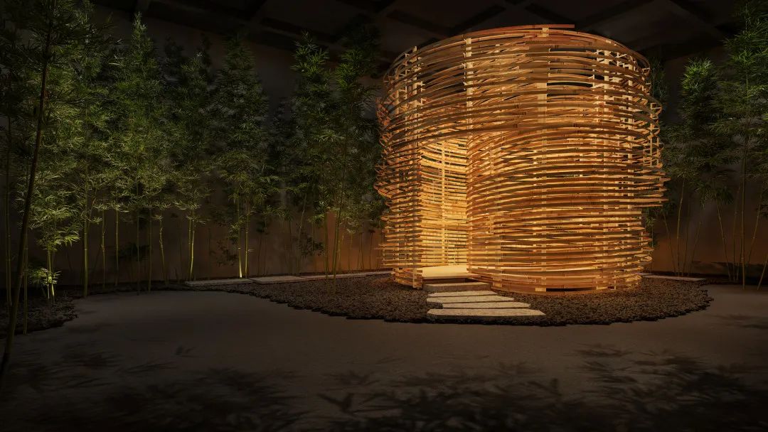 装置单元由入口的大型隧道装置和展厅内部的茶室景观装置组成,观众深度参与作品其中,在了解隈研吾建筑结构视觉魅力的同时,感受其对光影充满诗意的营造与用运。来到展览现场,首先映入眼帘的将是一个三百多平米的,空间隧道式结构装置。步入装置,观众将融入到以隈研吾与东京艺术大学团队创作的独立音乐为背景、灯光与香气环绕,充满时空错觉的诗意空间中。而位于展厅内部的茶室景观装置,将处于一片园林造景的中心位置,不同宽度的竹条螺旋排列,这种设计是对条形码的演绎,同时亦显现着属于东方的独特气质。茶室装置内部空间与外部环境相互映衬,是隈研吾设计理念中关于建筑空间向自然延伸的最佳体现。