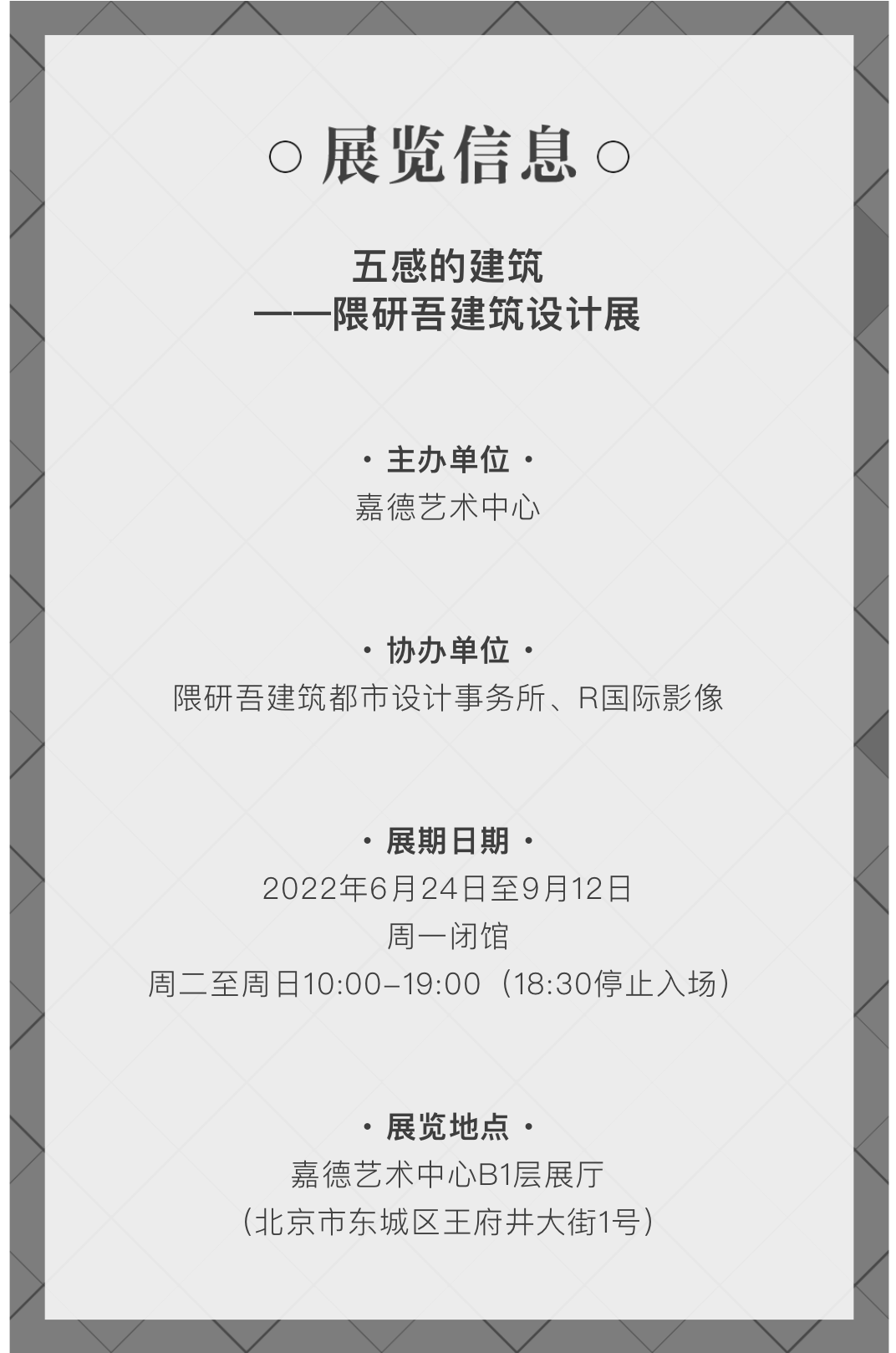 国际著名建筑设计师隈研吾最大规模体验式展览《五感的建筑》即将于今夏在北京嘉德艺术中心启幕,敬请期待。