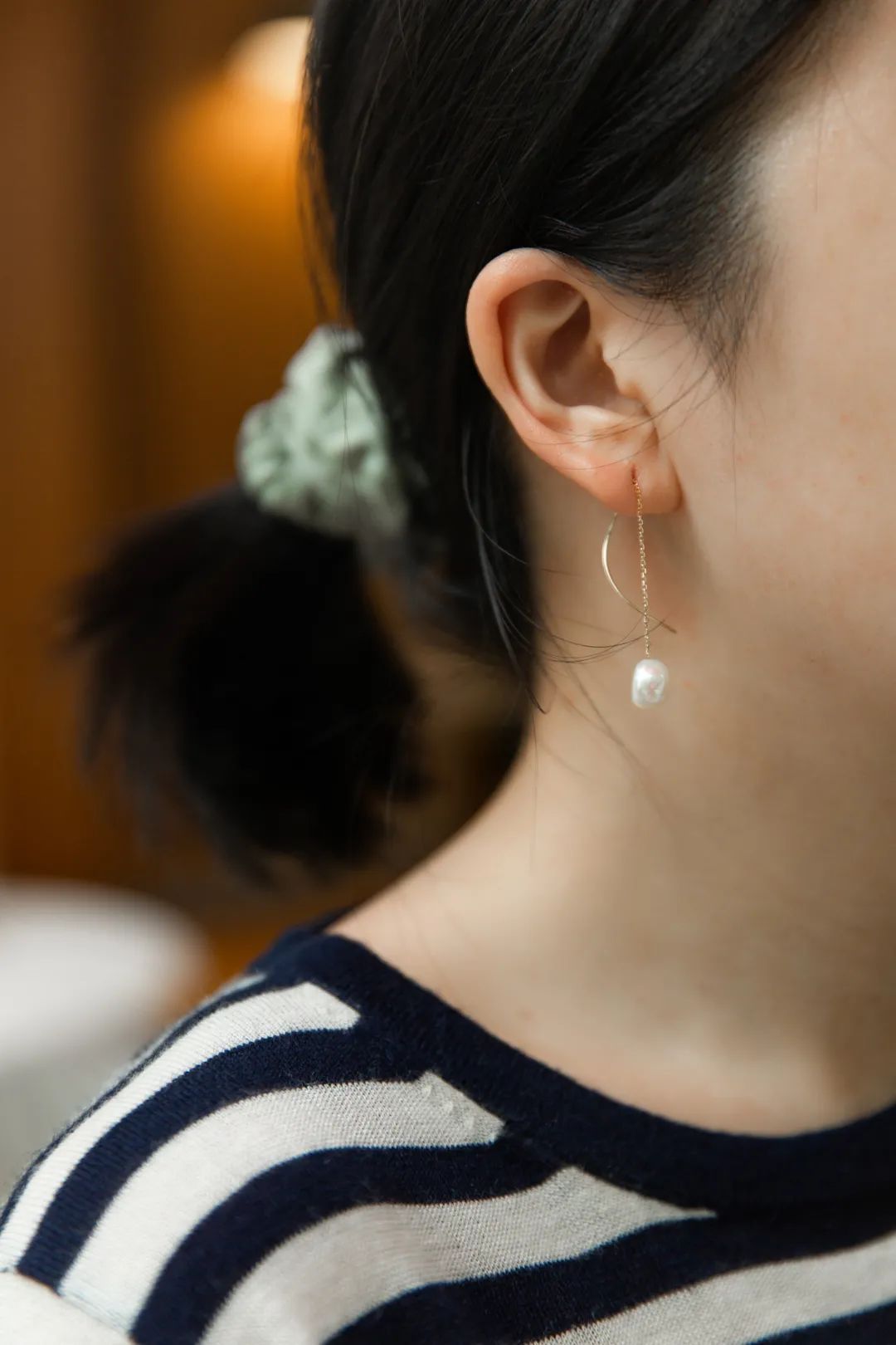 耳线的尾部是有一个卷曲的弧度,佩戴效果很灵动,用手工制成。而整副耳环的流线和淡水巴洛克珍珠也十分的般配。